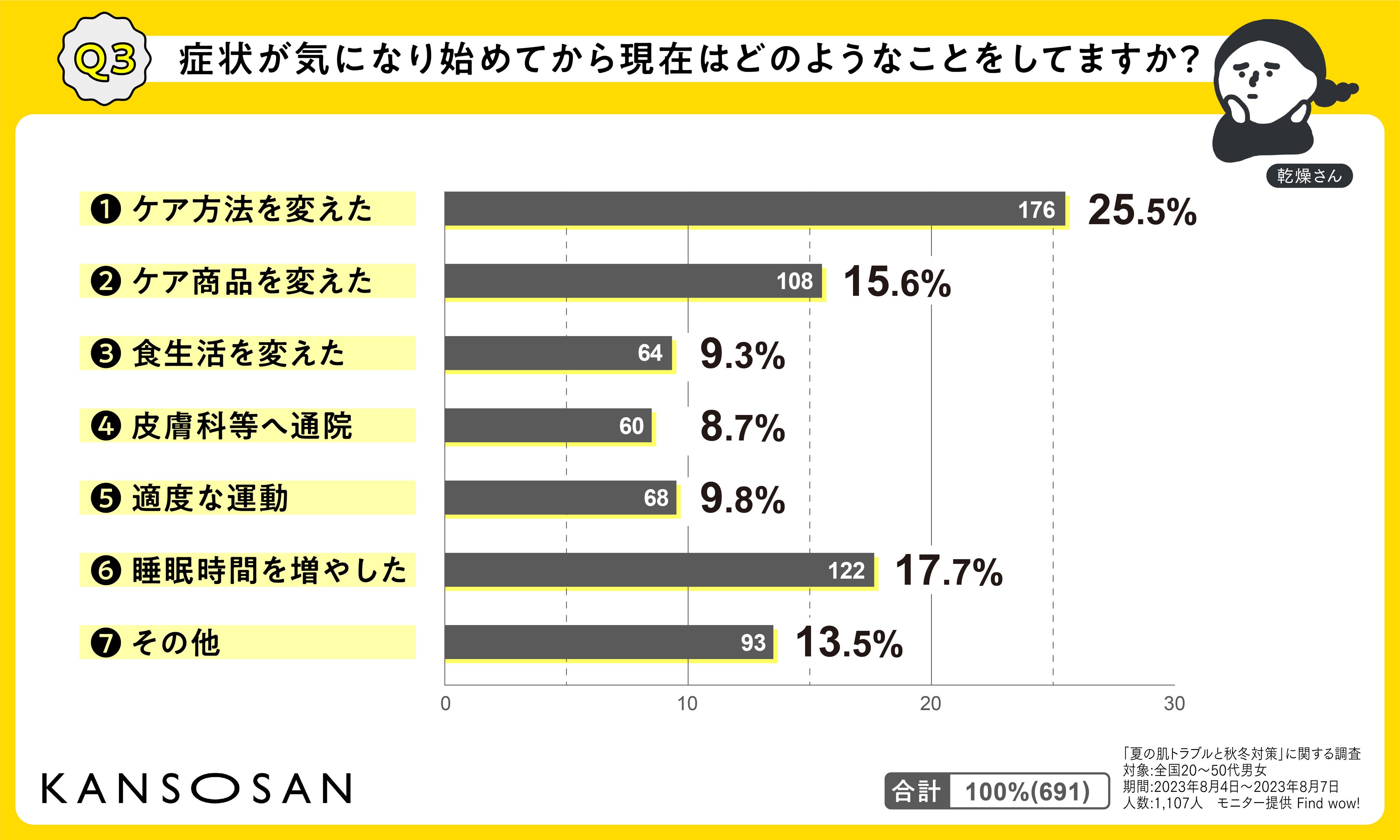「症状が気になり始めてから現在はどのようなことをしてますか?」と質問したところ、『ケア方法を変えた(25.5%)』と回答した方が最も多く、次いで『睡眠時間を増やした(17.7%)』『ケア商品を変えた(15.6%)』『適度な運動(9.8%)』『食生活を変えた(9.3%)』と続きました。