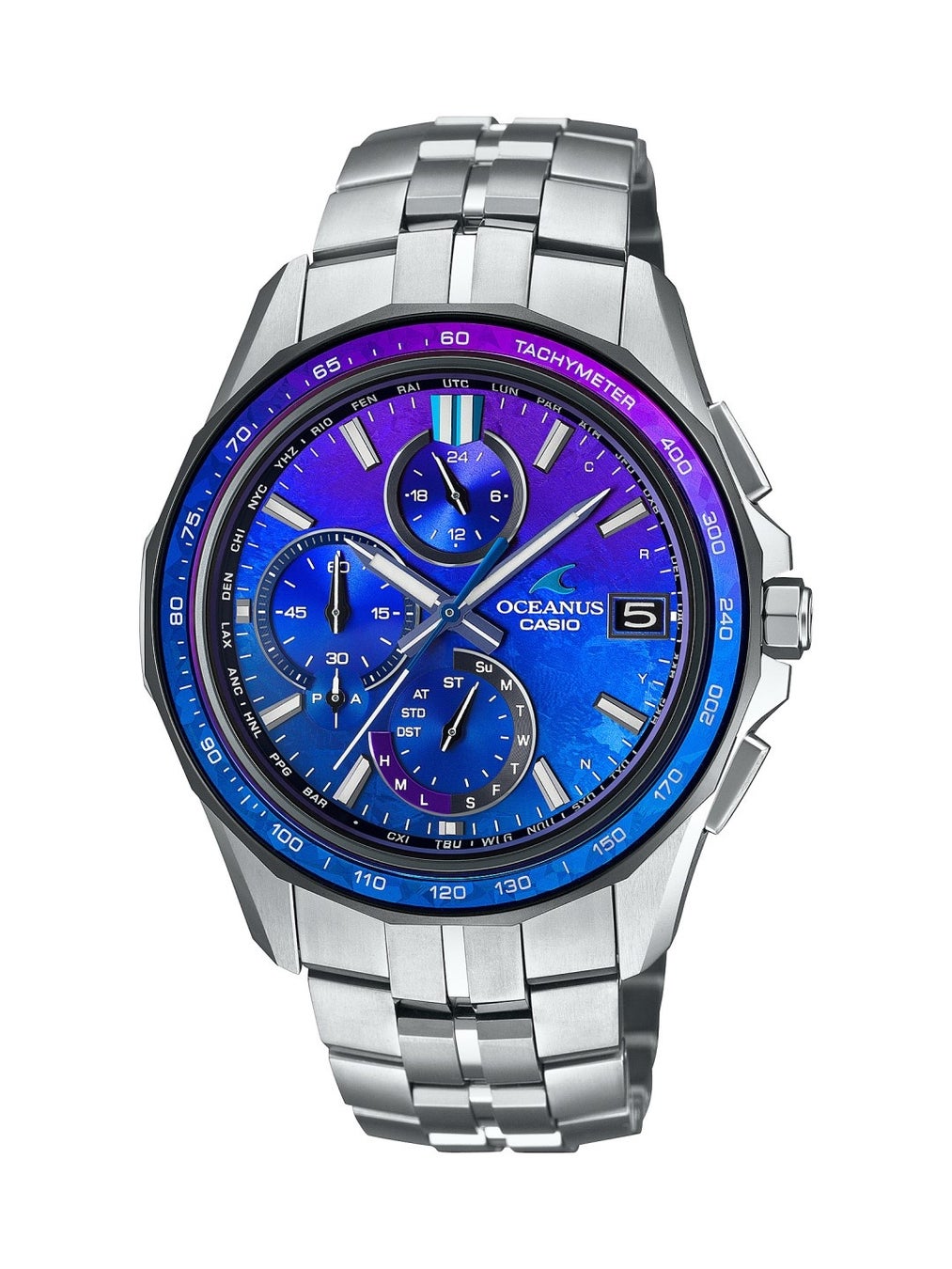 今回ご案内します『OCW-S7000C』は、タキメーターを備えスポーティ感を際立たせた“OCEANUS Manta”「OCW-S7000」をベースモデルに、サファイアガラスベゼルに複数のレーザー加工を施し、都会の夜の光が輝く海面のかがやきをイメージした限定ウオッチです。