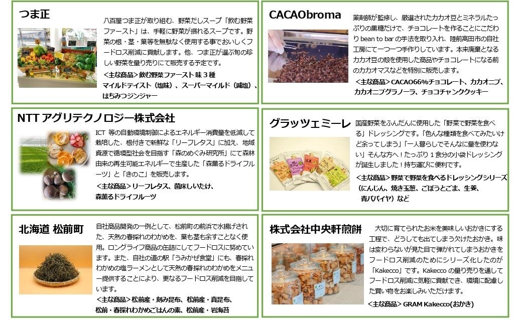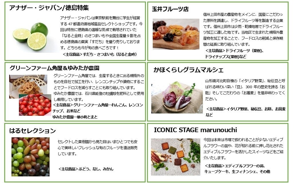 今年は、東京駅前を舞台に学生が経営する、47都道府県地域生産のセレクトショップ「アナザー・ジャパン」や、信州上田市産の農産物をメインに、国産にこだわった原料からドライフルーツ等を製造する「有限会社玉井フルーツ店」、福井県で農業に取り組む合同店舗「グリーンファーム角屋&ゆみたか農園」など、全国各地から集まった11店舗が初登場します。その他、山形県河北町の地域商社が運営する「かほくらしグラムマルシェ」、東京都渋谷区でフレッシュな旬のフル-ツを直送販売している「はるセレクション」など、昨年度も好評を博した注目の店舗も出店します。
