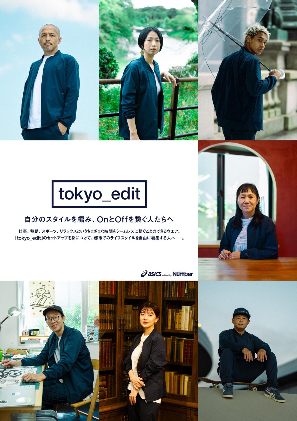 < tokyo_edit >はNumberが初めて本格的に企画・開発から携わったアパレルです。議論をする中でアシックスが誇る技術、機能、品質を、Numberの視点で〝編集〟して生まれたのは、OnのシーンでもOffのシーンでも着まわせる、快適な上下のセットアップ。日常とスポーツシーンを、自由に、シームレスに繋ぎたい人へ向けた1着になっています。