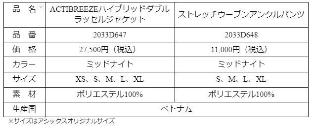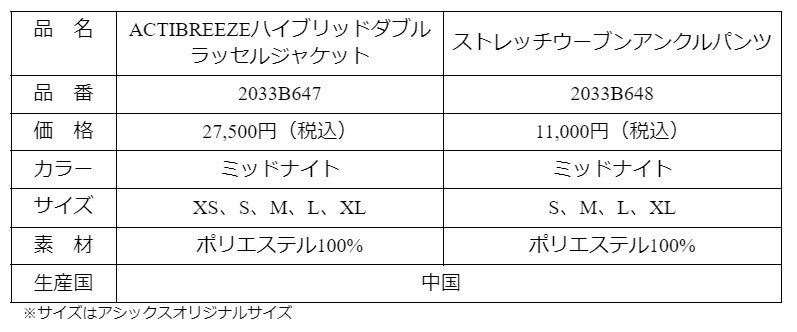 9月21日からアシックスオンラインストア、アシックス直営店(銀座、原宿、大阪、心斎橋、神戸の各店)で発売。メーカー希望小売価格はパンツが11,000円(税込)とジャケットが27,500円(税込)です。