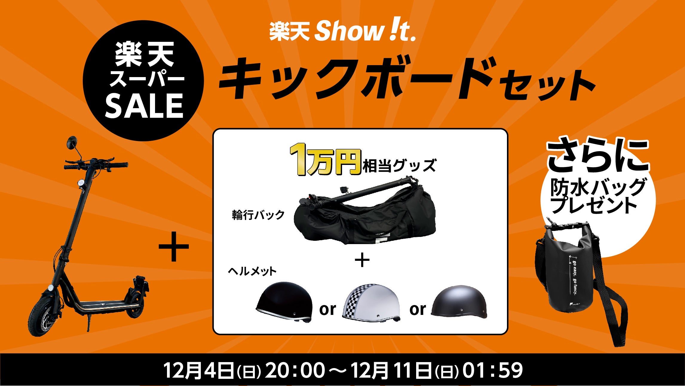 楽天市場「Show !t」12月4日(日)20時開始、ポイント10倍!楽天スーパーセールに参加。さらに、電動キックボードをご購入の方にヘルメット・輪行バックセットのプレゼントキャンペーンを実施。