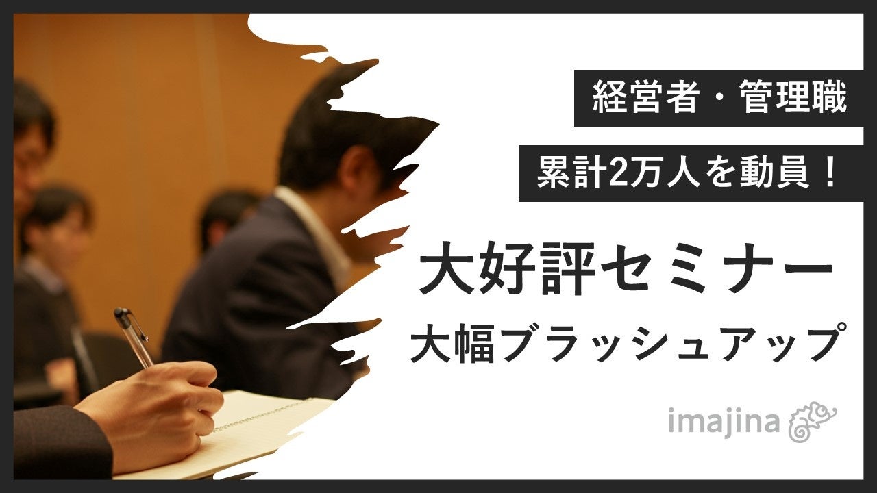 当社イマジナでは、これまでも企業成長のヒントを伝えるべく全国でセミナーを開催し、累計で約2万人の経営者・管理職・人事をはじめとする皆様にご参加いただきました。今回、上記のような急激な時代の変化を受け、企業が人材の力を最大限に活かすための考え方や手法をさらに豊富にお伝えできる内容へとブラッシュアップいたしました。