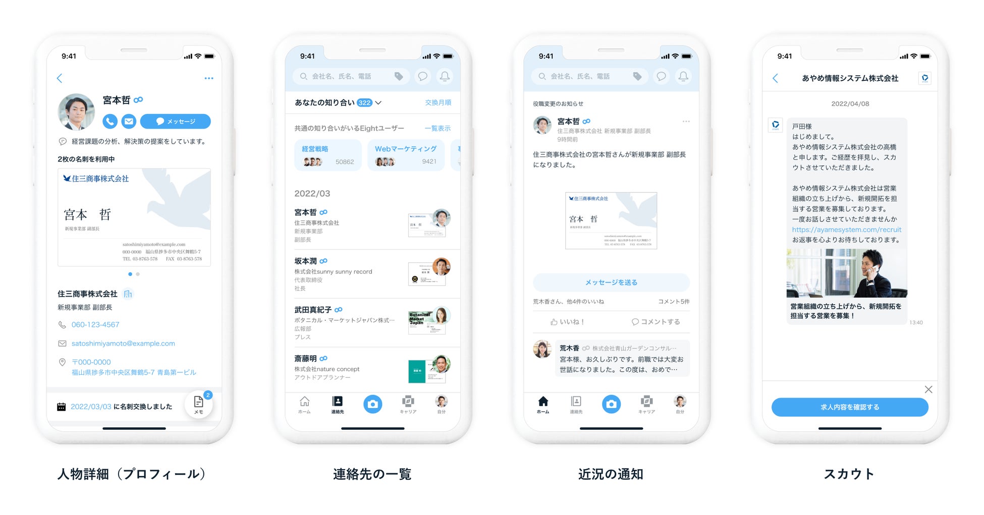 Eightは、2012年の提供開始以来、ビジネスパーソンのライフタイムに伴走するサービスとして、出会いの機会の提供やネットワーク構築、キャリア形成をサポートし、2021年11月末時点で300万人を超えるユーザーに利用されています。Eightでは名刺交換で培った人脈の管理だけでなく、ユーザー自身の過去から現在までの名刺の登録ができ、キャリアサマリやスキルタグの機能を活用することで、自らのキャリア情報を蓄積していくことが可能です。また、スキルアップや学びの場であるビジネスイベントとの出会いや、キャリアチェンジにつながる企業との出会いなど、ユーザーはキャリア形成に必要な情報・機会を得ることができます。