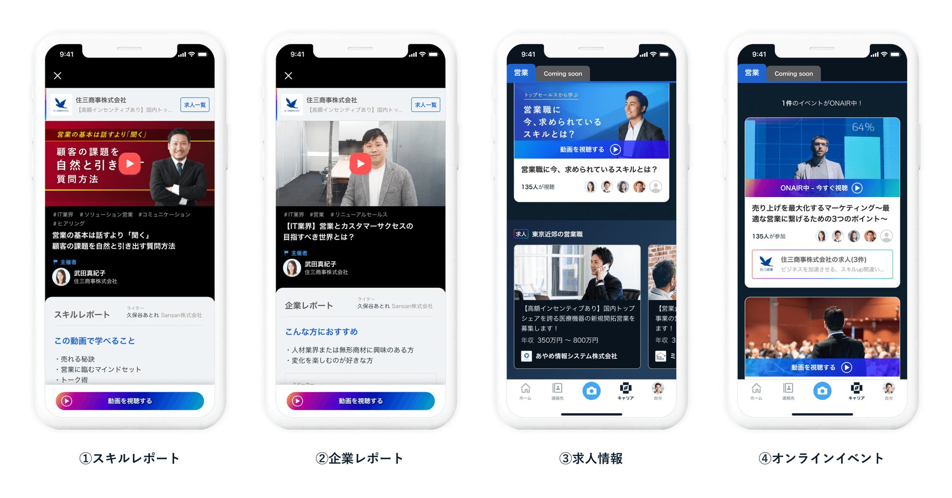 新しく搭載するキャリアタブでは、自分磨きに役立つ情報や、知らなかった企業の情報、求人情報を収集することができます。これらの情報は職種ごとに表示され、実装時には営業に関わる情報が掲載されています。今後、新たな職種を順次追加していきます。