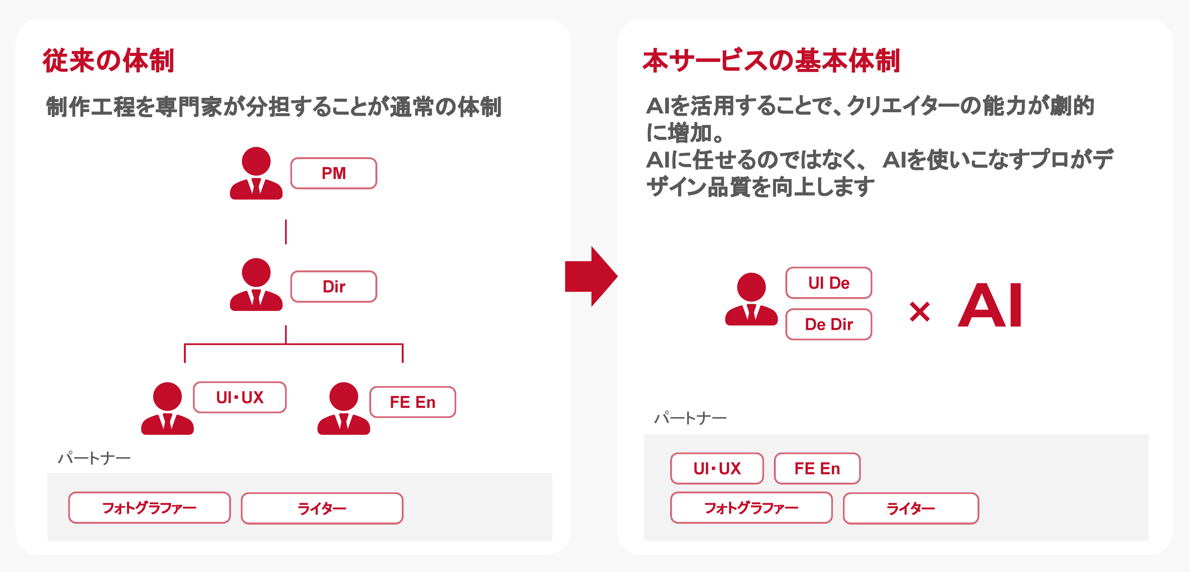 AIによって時間のかかる作業を効率化し、当社のクリエイターが「顧客の真の価値とは何か」を掘り下げる創造的な時間に注力いたします。密なコミュニケーションを通じて顧客の本質的な課題を解決し、AIを駆使しながらも「人の温かみ」を感じられるアウトプットをお届けいたします。