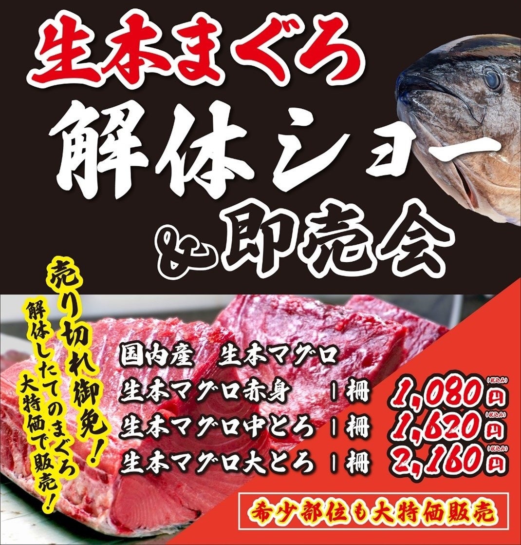本イベントでは、国内の選ばれた産地で育てられた養殖マグロを、水揚げから店頭まで一度も冷凍せず輸送。マグロの鮮度を維持した状態で捌かれるため、脂ののった生ならではの格別の美味しさを味わっていただけます。解体ショーの後は柵に切り分けた大トロ、中トロ、赤身などを大特価で販売いたします。この機会に、ぜひ品質の高い国産養殖生本マグロをご賞味ください。