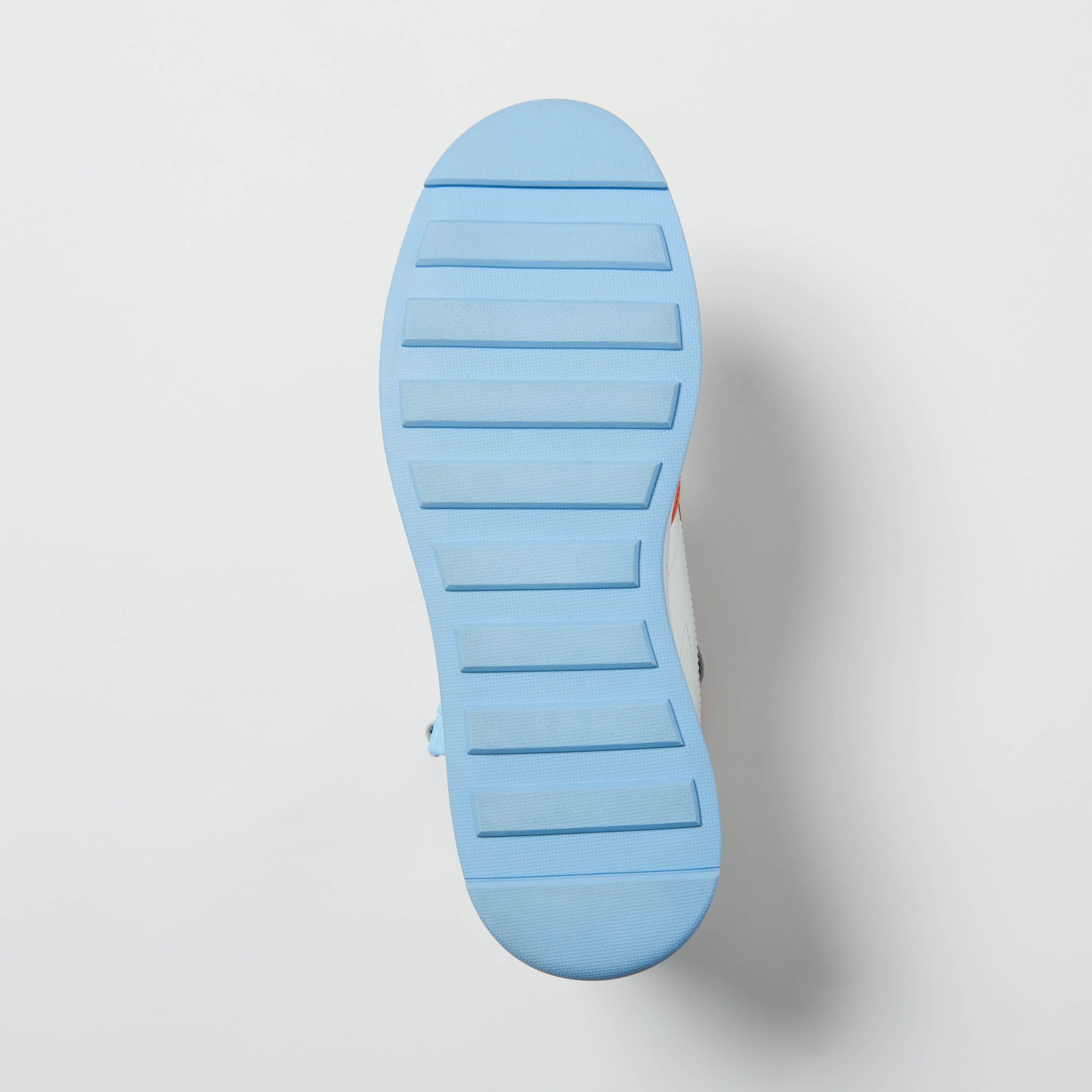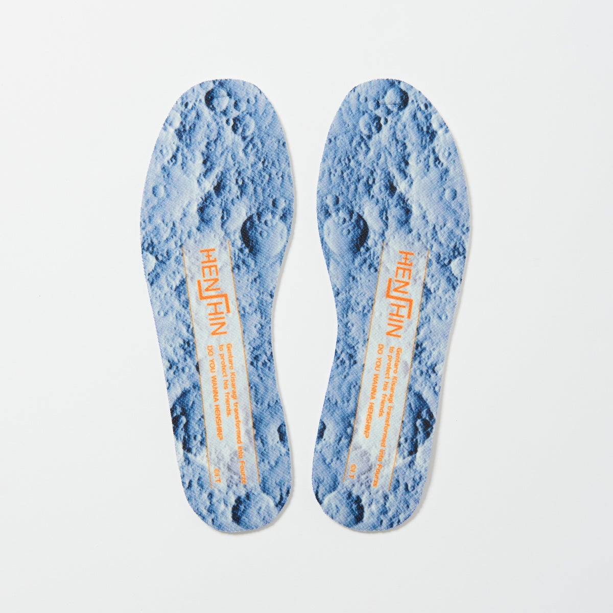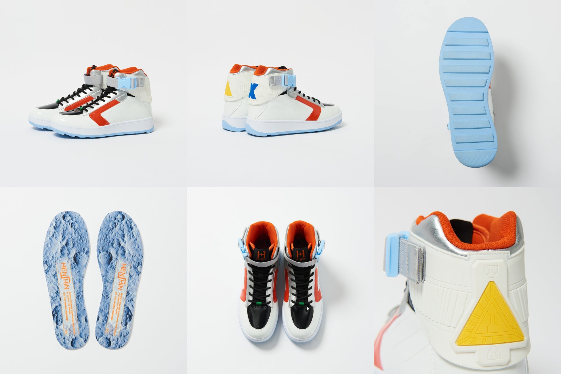 エナメル加工生地にキルティングを施すことでフォーゼのボディを表現しました。両サイドのオレンジ色のラインもさることながら、ポイントで挿すグリーンや、ライトブルーがスニーカー全体にリズムを与え、バランスを整えています。最大の特徴でもあるヒールのロケットモジュール表現は、進行方向に向けて発射する様を想起させるポップなレイアウトで、かつストラップと相まって非常に機能的なディテールとなっています。インソールでは月面に着地する様を、またクリアブルーのソールから浮遊感を演出。斬新なデザイン性を保ちながら、あらゆるシチュエーションでコーディネートのしやすいスニーカーに落とし込みました。