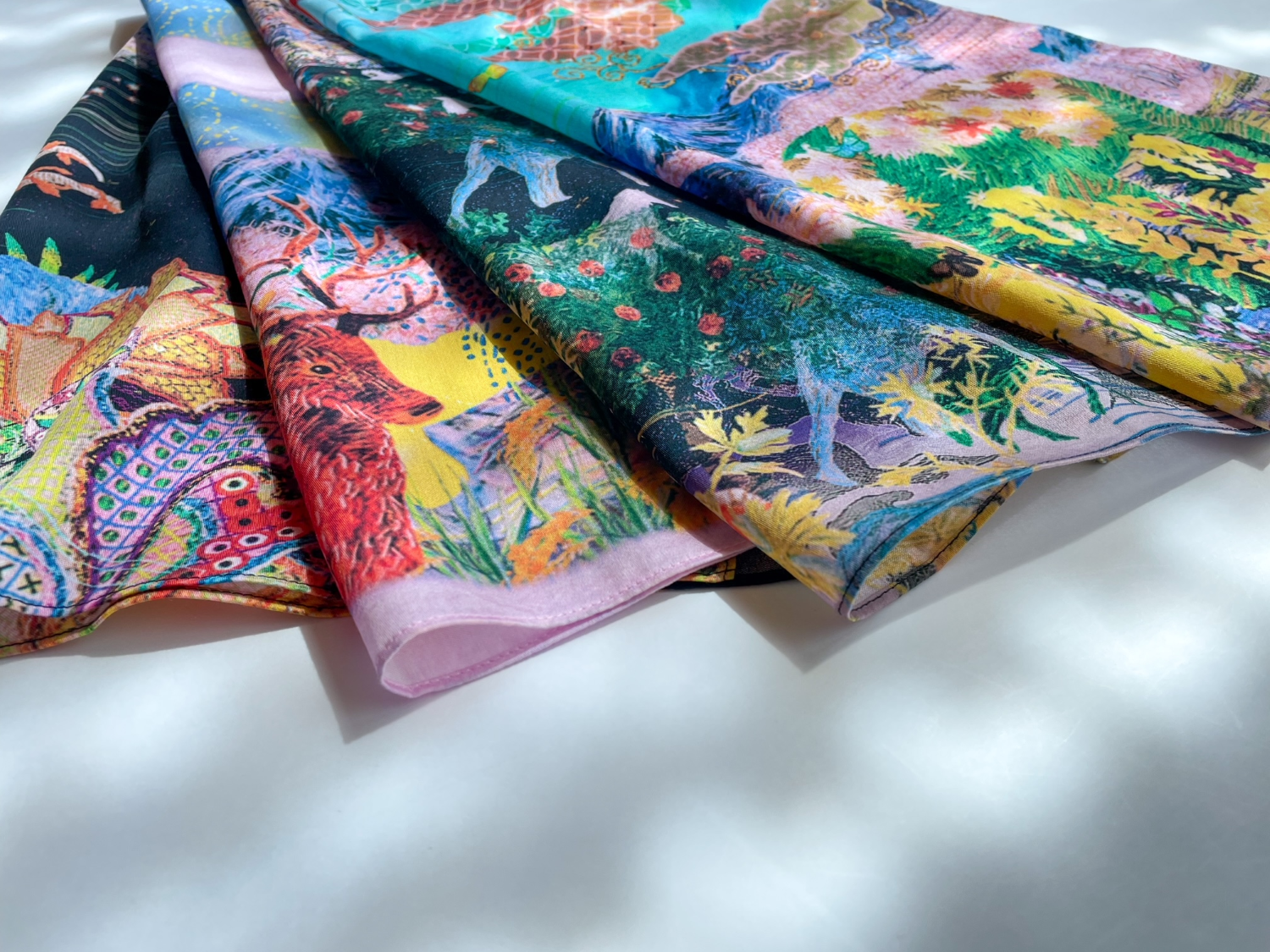 綿100%のサテン生地を採用し、サラっとした肌触りが特徴です。ハンカチの用途はもちろん、ヘアアクセサリーとして使ったり、バックチャームにしたりと、お客様ご自身で自由にお楽しみいただけるアイテムになっています。制作にあたり清川は「日常に美しい生命の息吹を手元に持って感じてもらえたら。」と商品への想いを語っています。