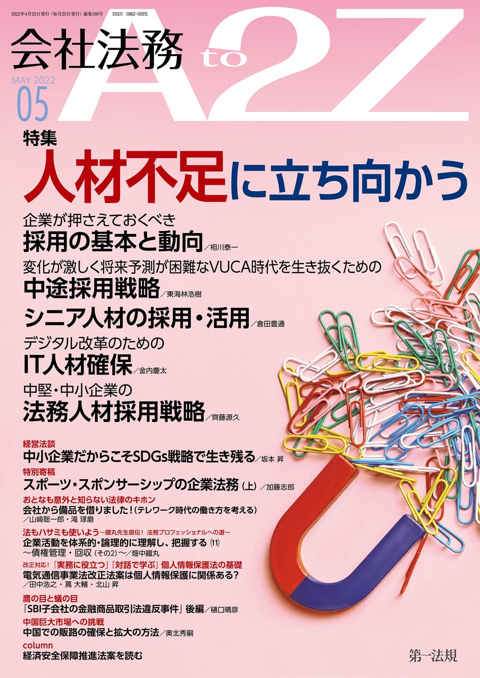 【会社法務A2Z】最新の企業トレンドや法改正情報の解説を毎月お届け!2022年5月号では「人材不足に立ち向かう」をテーマに、企業の採用の基本や動向などを解説