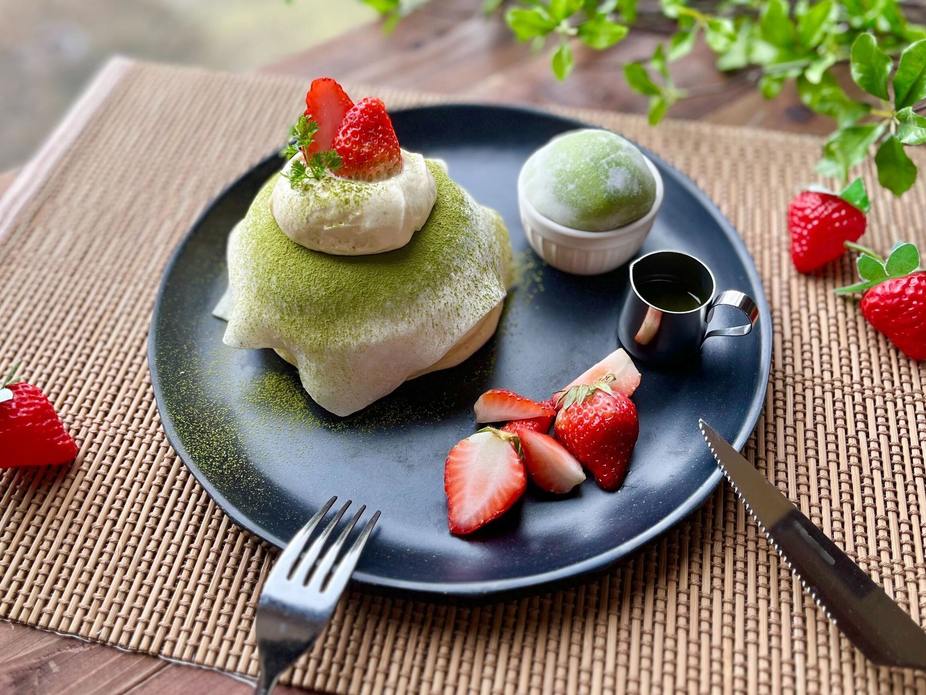 もちもちの求肥とクリーム、いちごと、甘みとコクのある袖ヶ浦のお茶をふわふわのぱんケーキの上にトッピング。抹茶ソースをかけてお召し上がりいただきます。