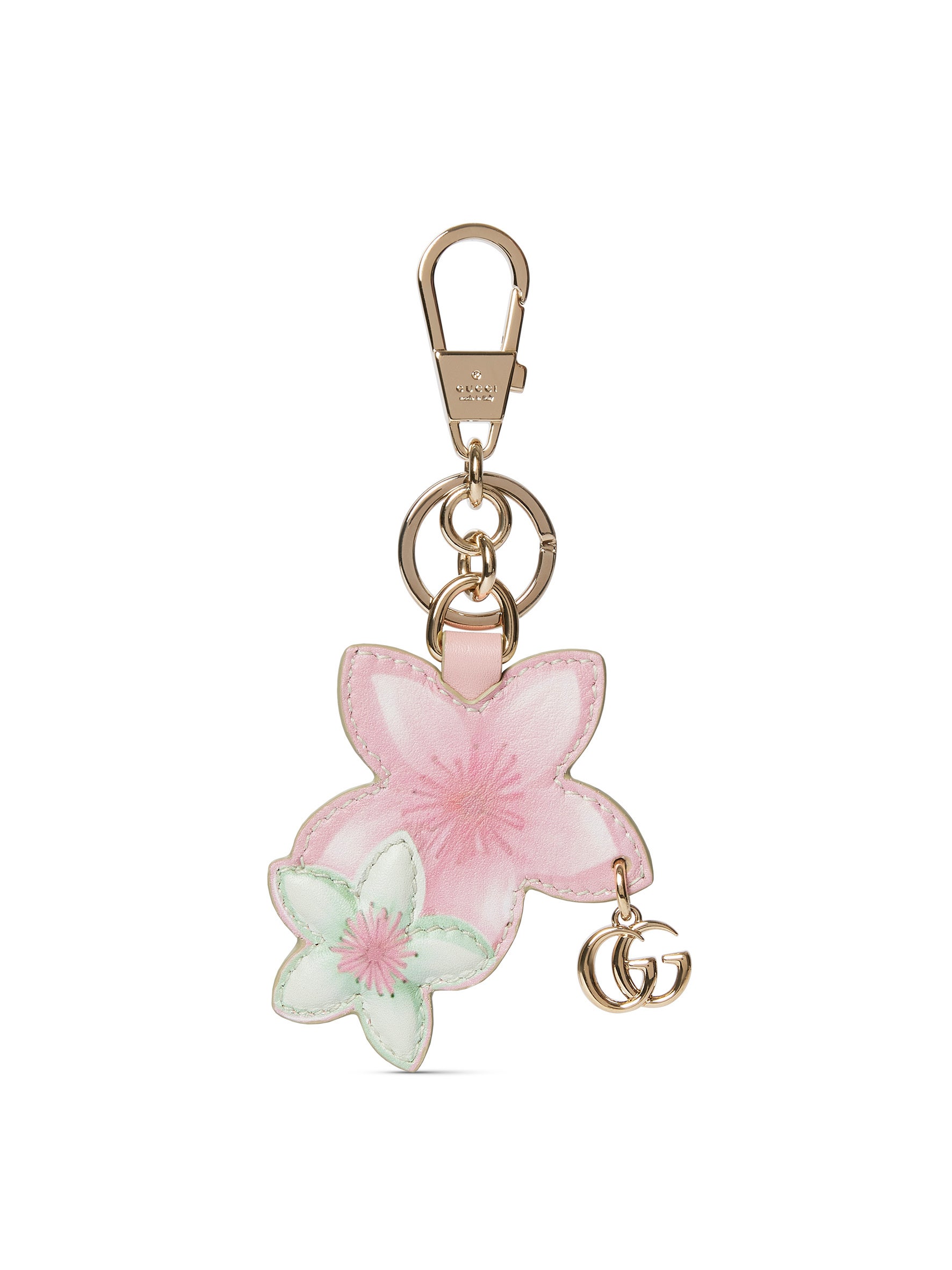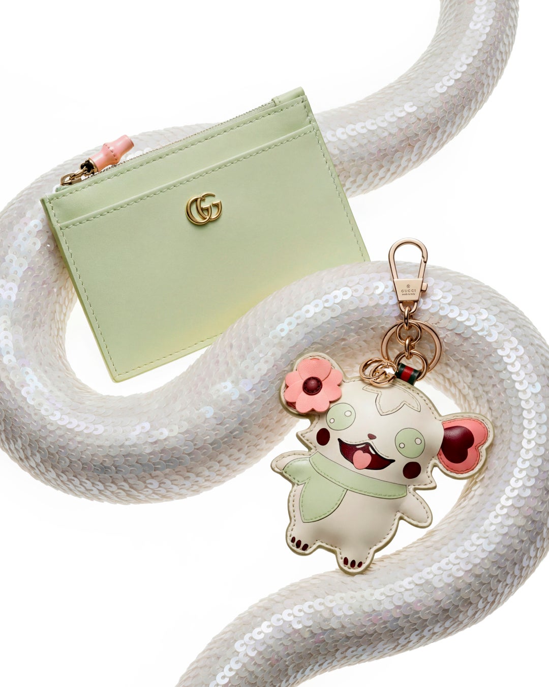日本限定アイテムとして、可憐な桜モチーフをあしらったミニウォレットとロングウォレットが登場。どちらもバンブー型のジッパープルとダブルGハードウェアがグッチならではのアクセントを添え、ミニウォレットは外側が新芽を思わせる淡いグリーン、内側はピンクレザーに桜をあしらった華やかなデザインです。また、桜の花を象ったチャームと桜飾りを付けたオリジナルキャラクターのチャームもあります。