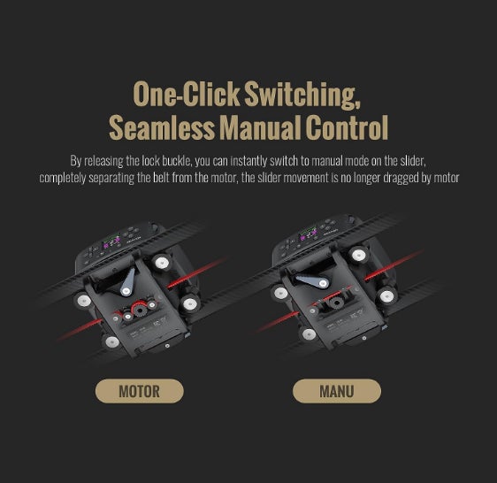 ロックバックルを解除すると、スライダーの手動モードに即座に切り替えることができ、ベルトがモーターから完全に分離され、スライダーの動きがモーターに引きずられることはなくなります。