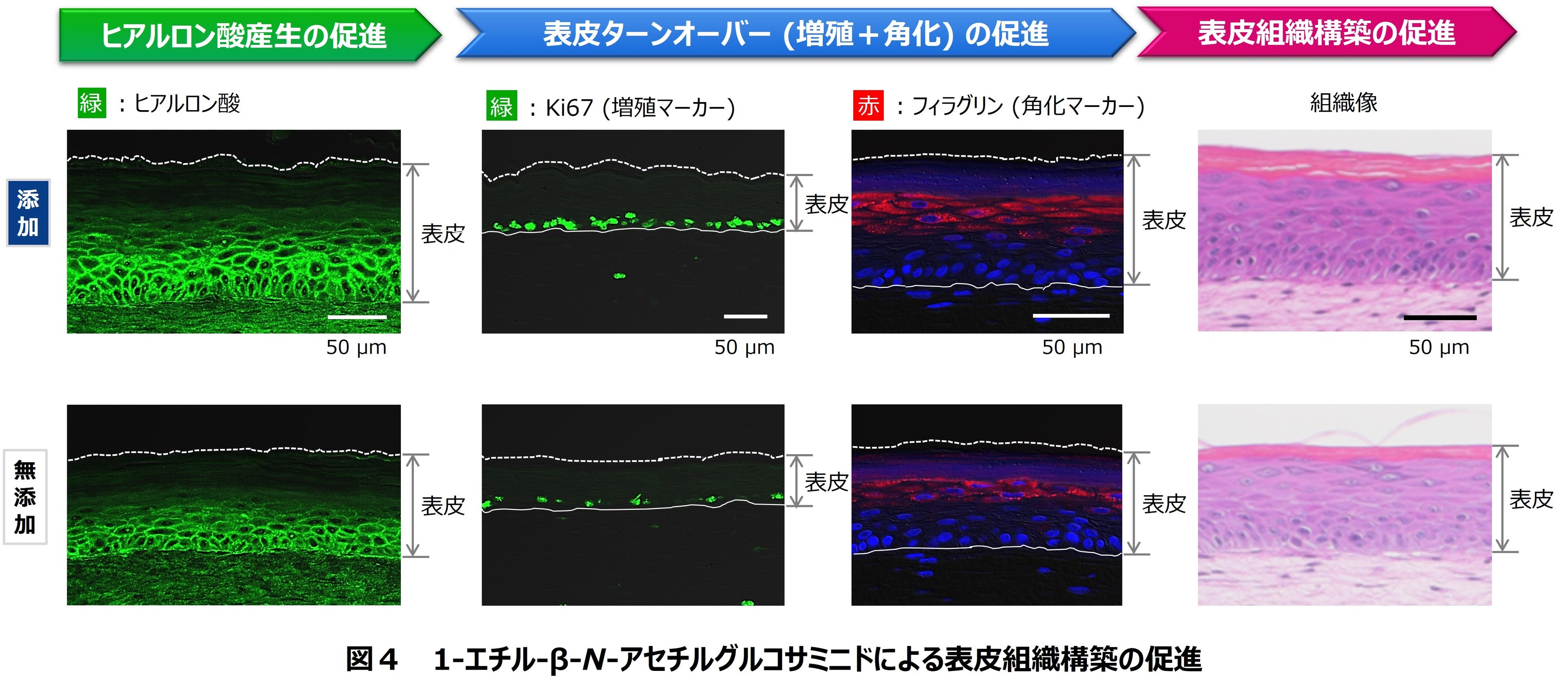 さらに、新規N-アセチルグルコサミン誘導体を3次元培養ヒト皮膚モデルに添加したところ、表皮ヒアルロン酸が増加するとともに、基底層における表皮細胞の増殖、及び有棘層から顆粒層における表皮細胞の角化が促進し、表皮の厚みが増加することが確認できました(図4)。一方、これらの効果は、β-N-アセチルグルコサミニダーゼの働きを阻害して、N-アセチルグルコサミン誘導体をN-アセチルグルコサミンへ変換できないようにすると、いずれも消失しました。