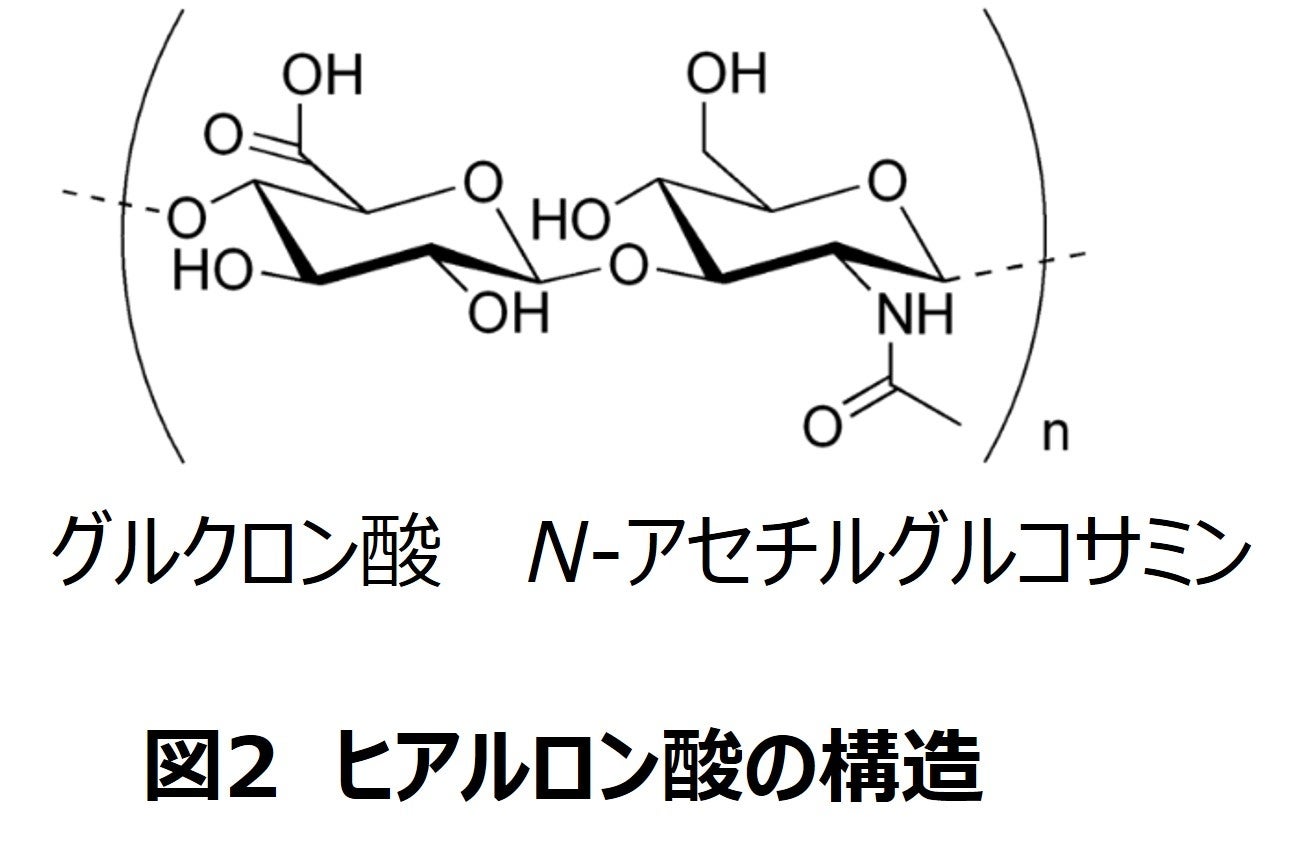 ヒアルロン酸は、N-アセチルグルコサミンとグルクロン酸の2種の糖が交互に結合した高分子多糖で、その分子量は数百万にも及ぶ生体で最大の高分子ポリマーです(図2)。