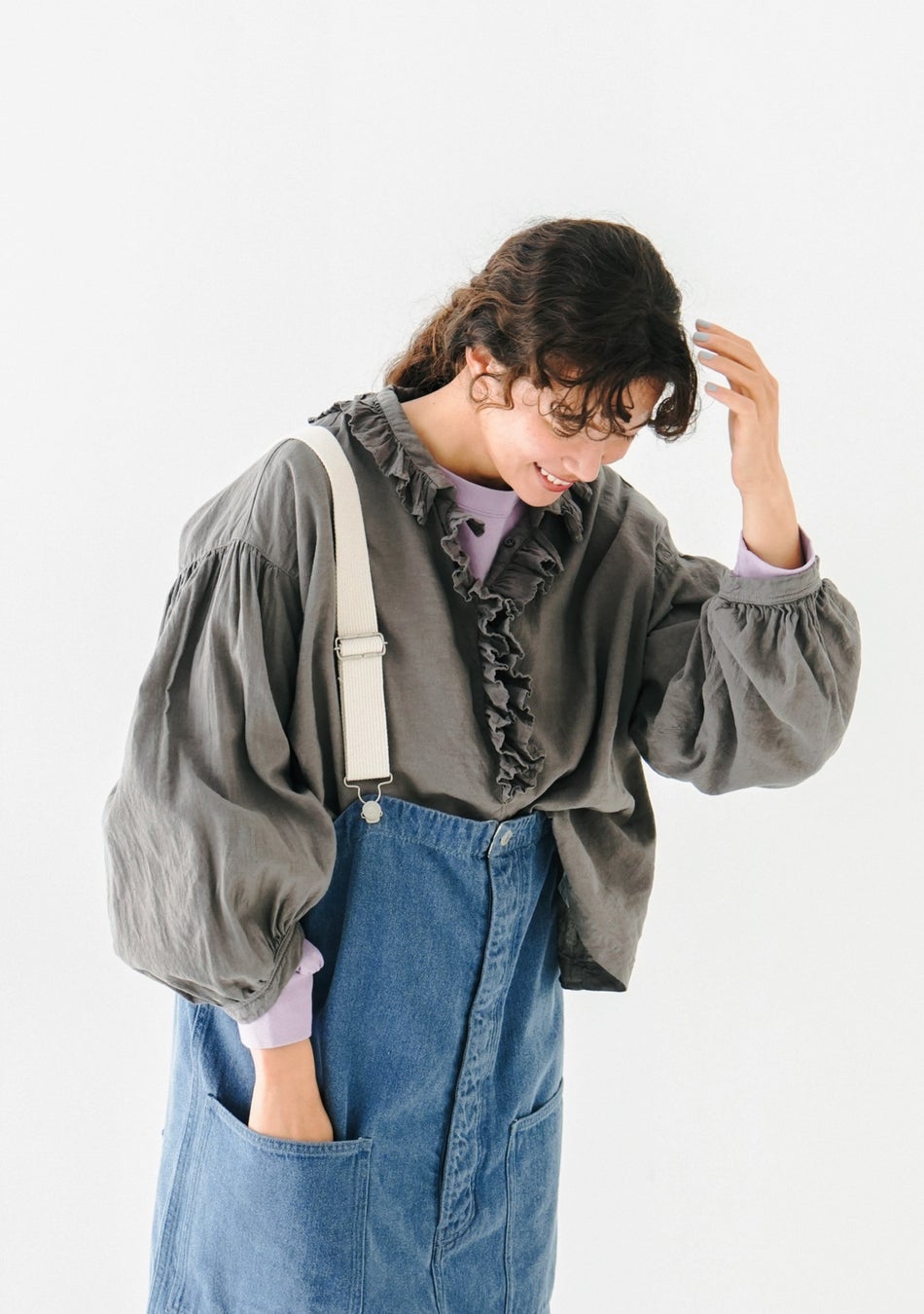 洗いざらしのようなシワ感とふくらみのある味わい深い風合いに仕上げた生地を使用。