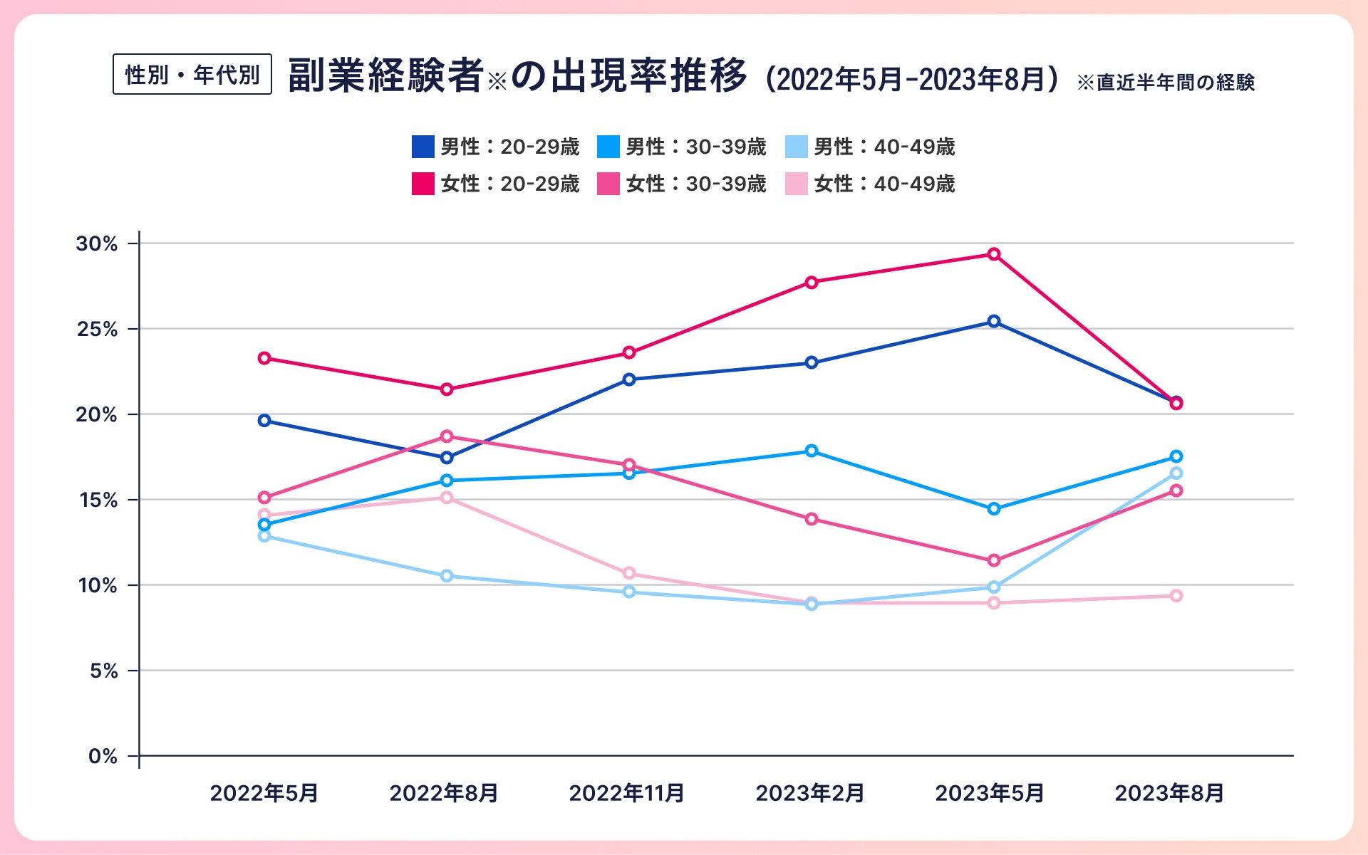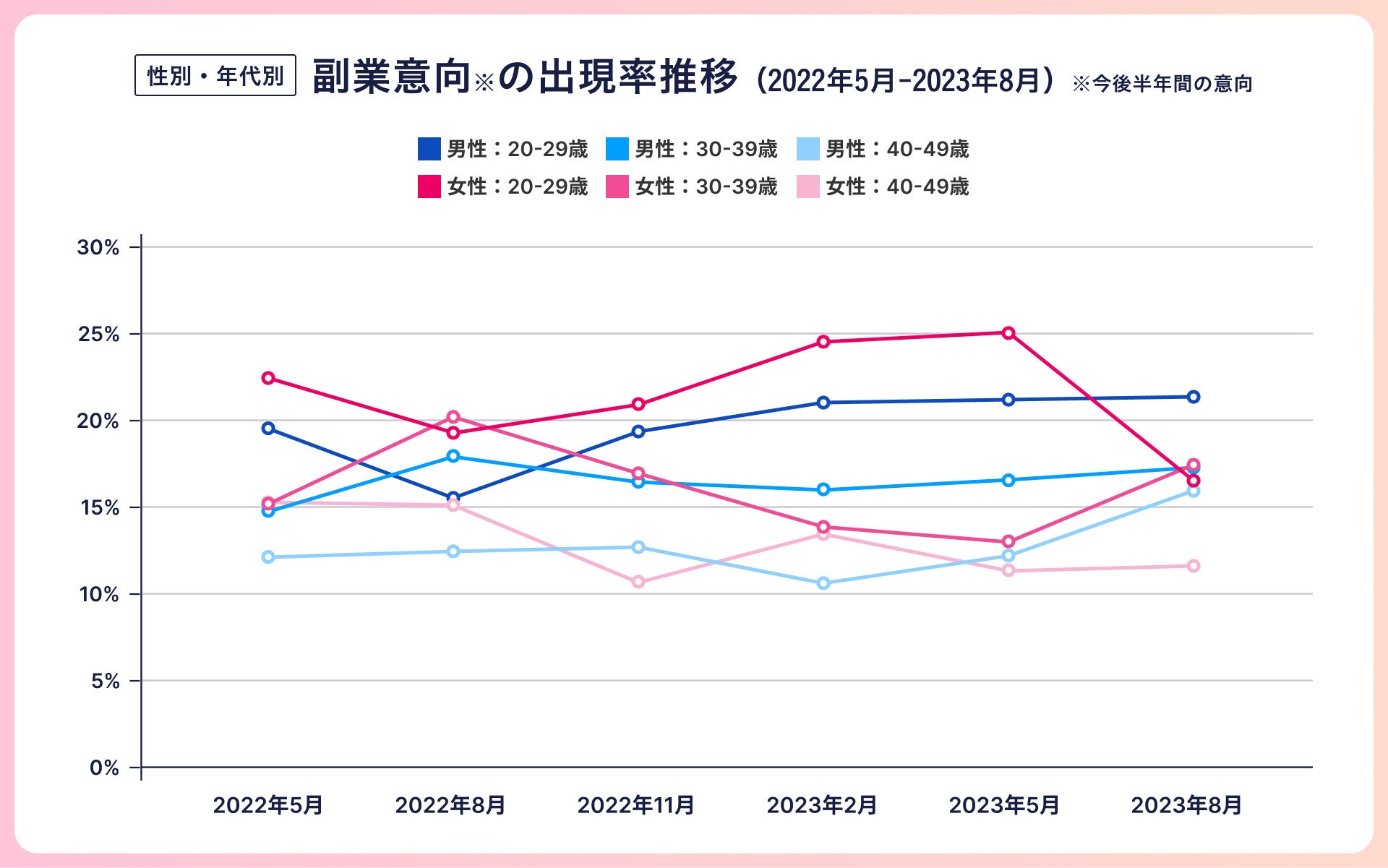直近半年間の副業経験者の推移を見てみると、前回の調査から、男女ともに20代が減少しており、男性は25.6%から20.6%、女性は29.6%から20.6%となりました。一方で、男女ともに30代以降は前回と比べると増加しており、30代男性は14.3%から17.6%、30代女性は11.7%から15.5%、40代男性は9.9%から16.3%、40代女性は9.0%から9.4%となりました。また、直近半年間の副業意向者の推移を見てみると、前回から女性の20代が大幅に減少しており25.0%から16.6%でした。一方で女性の30代は13.2%から17.2%、男性の40代は12.2%から16.0%と上昇傾向にありました。