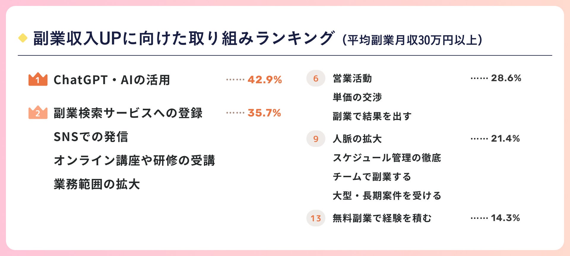 平均副業月収30万円以上稼いでいる方が副業月収アップのために取り組んでいることをランキング形式で見てみると、1位は「ChatGPT・AIの活用」で42.9%となりました。同率2位となったのは、「副業検索サービスへの登録」「SNSでの発信」「オンライン講座や研修の受講」「業務範囲の拡大」で35.7%でした。次いで同率6位となったのは「営業活動」「単価の交渉」「副業で結果を出す」で28.6%となりました。