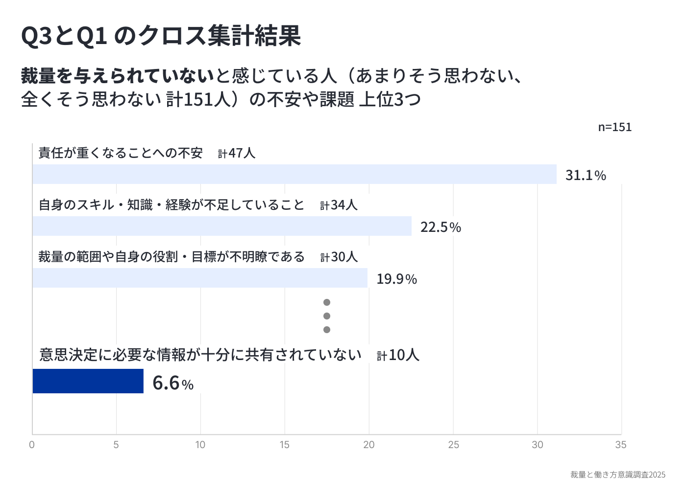 3. 裁量“あり”層の不安は「責任」「スキル」「情報共有」が三大要因 裁量を与えられている層(330人)の不安上位は以下のとおり。 ・責任が重くなることに不安:27.9% ・情報共有の不足:21.8% 裁量“なし”の層では「情報共有の不足(6.6%)」は上位に入らず、 |