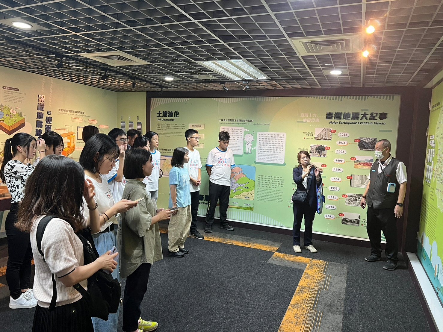 初日の台北市防災科学教育館では、同館のスタッフの解説のもと、火事・大雨・地震の状況を再現した装置を体験しました。生徒たちは、再現状況が本格的であることに驚きながらも、災害時に自分の身を守る行動をすることの重要性を学びました。