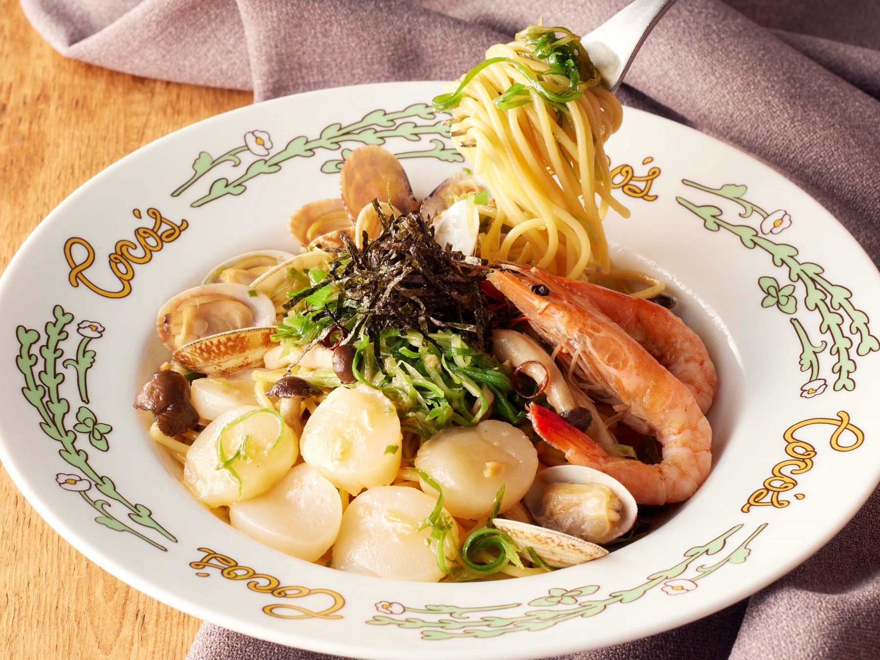 ガーリック醤油ベースの和風パスタに、ほたて、あさり、有頭エビなどの魚介と、程よい辛味の翡翠(ひすい)ねぎをたっぷり盛り付けた、満足感のある一品です。ぷりっと甘い北海道産ほたてと食べ応えのあるシャキシャキ食感の翡翠(ひすい)ねぎを、食欲をかき立てるガーリック醤油風味のパスタと一緒にお召し上がりください。