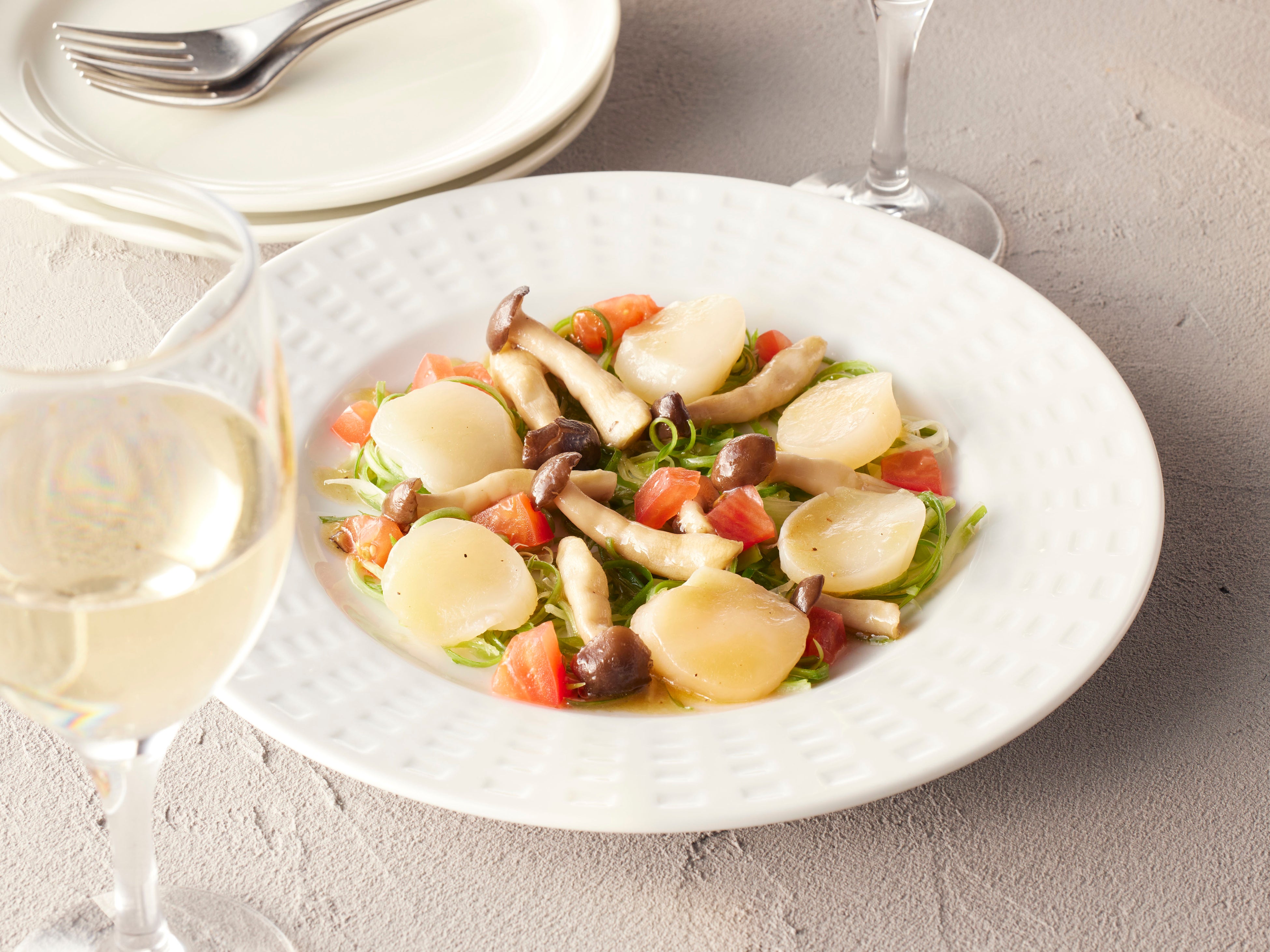 北海道産ほたてと翡翠(ひすい)ねぎの温製カルパッチョ