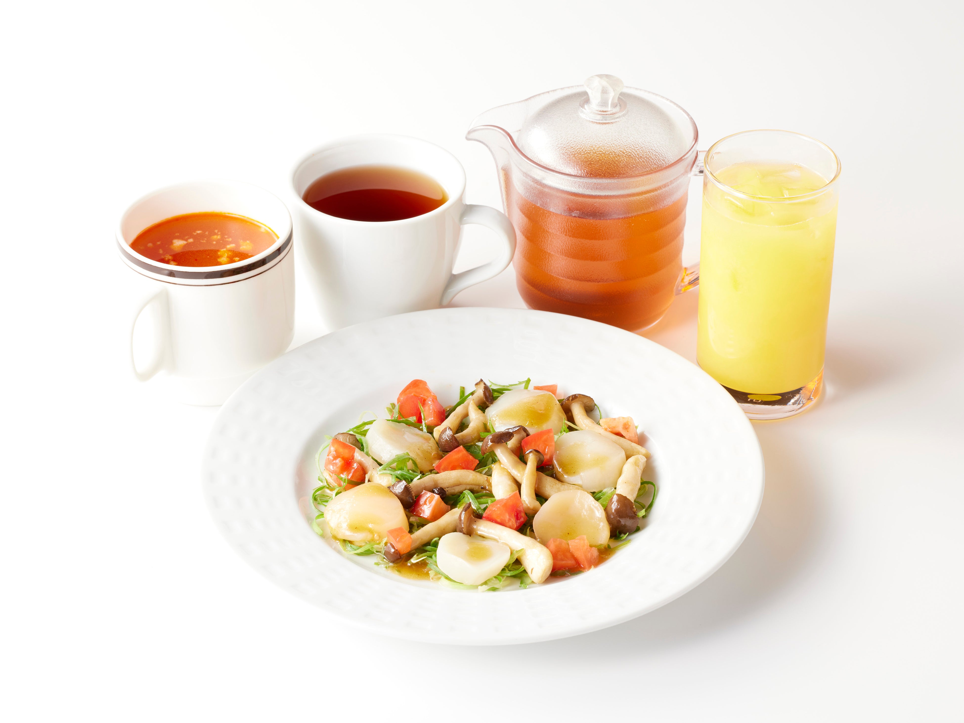 また、お好きなメニュー(税込209円以上)と一緒にご注文いただくとお得になる「北海道産ほたてと翡翠(ひすい)ねぎの温製カルパッチョ ドリンクバー&スープバーセット」も登場します。各商品を単品でご注文いただくのに比べ、242(税込)円お得にお楽しみいただけます。