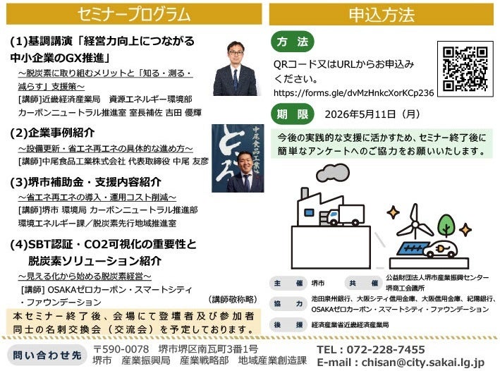 令和8年5月11日(月曜)までに、以下の(公財)堺市産業振興センター申込フォームからお申込みください。※先着順のため、お早めにお申し込みください。