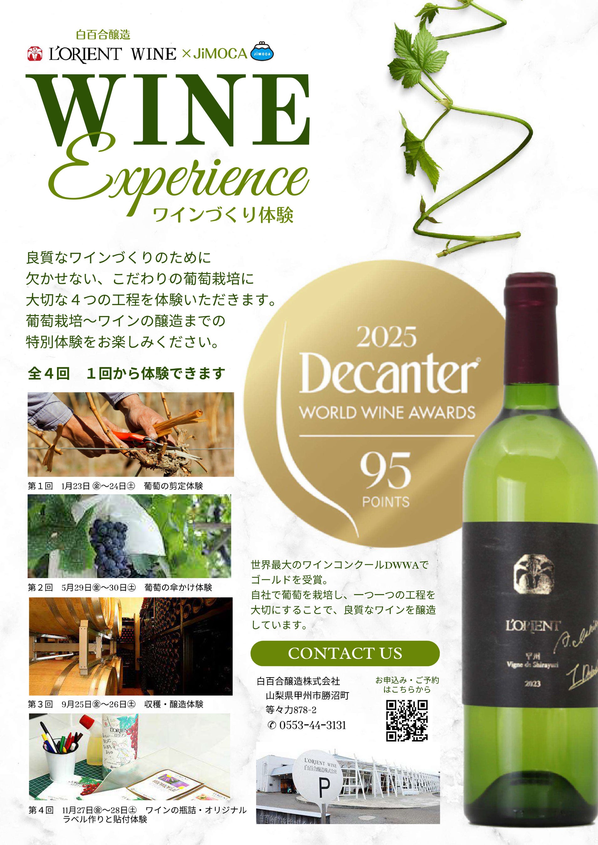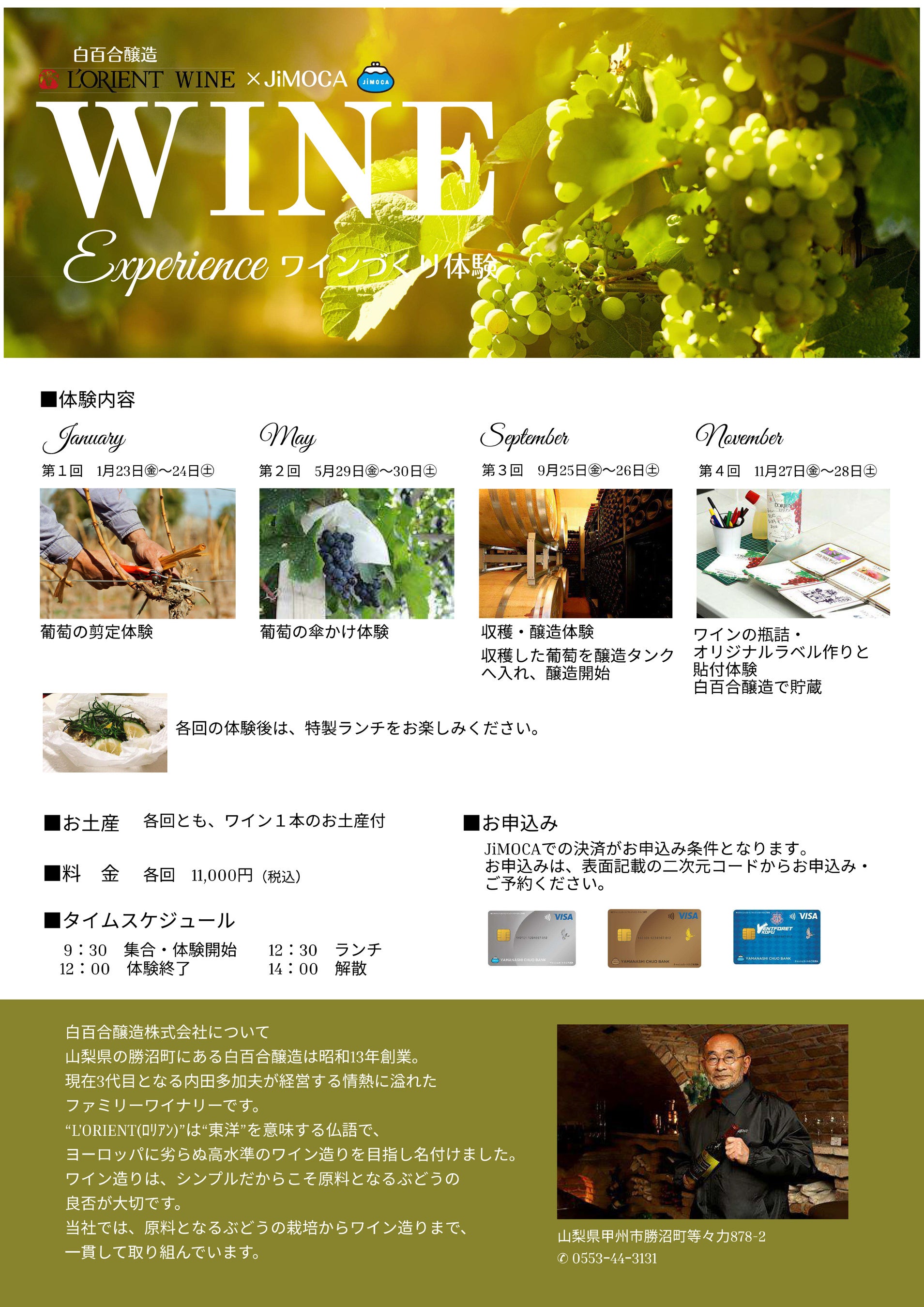 本キャンペーンは、世界有数のワインコンクールで金賞を受賞した白百合醸造において、ブドウ栽培から醸造までの製造工程を通したワイン造りをJiMOCAの会員に体験していただくものです。