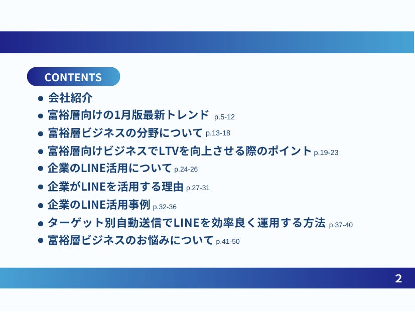 本レポートでは、業界別の事例や弊社の実績をもとに具体的なLINEの活用方法を理解していただけます。富裕層向けビジネスでLINEを用いた効果的なLTV向上をご検討されている方におすすめの内容です。
