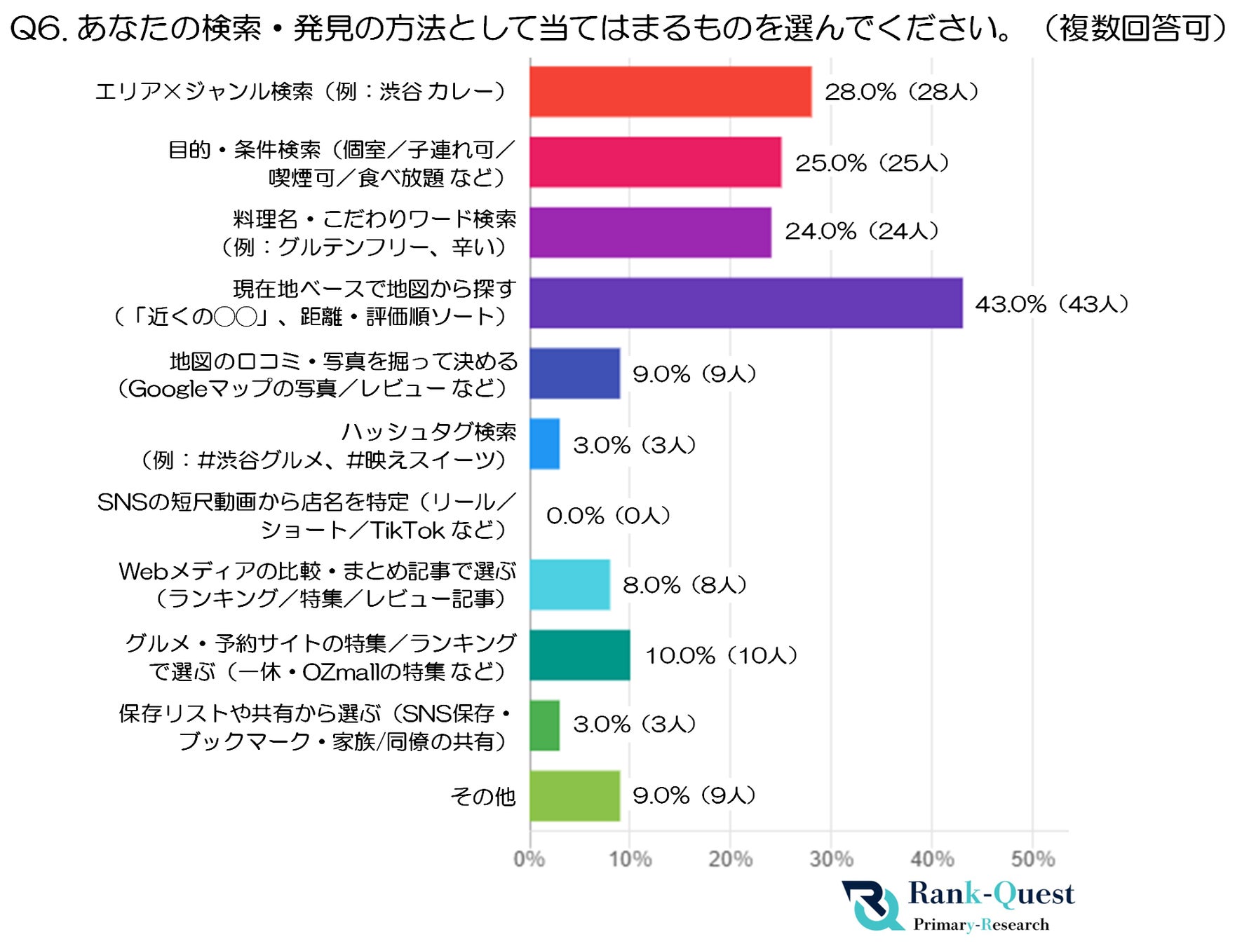 最も多かったのは「現在地ベースで地図から探す」(43.0%)で、近くの店を距離や評価順で確認しながら選ぶスタイルが主流となっています。リアルタイムで場所を探す利便性が高く、外出先での“即決型”の行動がうかがえます。