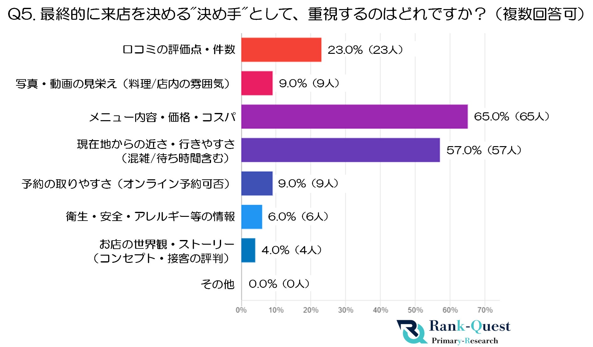 また、「衛生・安全・アレルギー等の情報」(6.0%)や「お店の世界観・ストーリー」(4.0%)」は少数派であり、情緒的な魅力よりも、わかりやすく比較しやすい指標を基準に選ばれる様子が見られます。