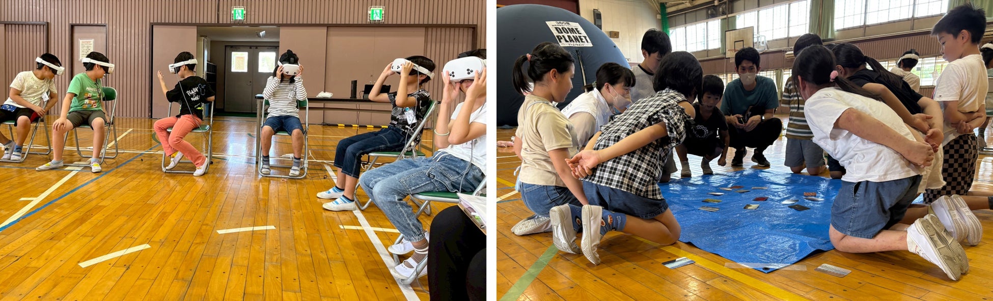春日井市立白山小学校の4年生を対象に、海の魅力と海洋問題について学ぶ体験型プログラム「海の大冒険!ブッチくんと学ぶ探検ツアー!」を実施しました。3・4時間目の授業を使い、体育館で「360度映像のエアドーム型体験プログラム」と「VR体験&さかなかるたゲーム」の2つのグループに分かれ、3つのコンテンツを体験してもらいました。巨大エアドームの中で360度の海中映像に包まれながら、ナビゲーターの「ブッチくん」と対話形式で海を学ぶプログラムとVRゴーグルによるVR海中遊泳体験、魚の鱗の凹凸を再現した「さかなかるた」ゲームによる五感を刺激するプログラムで多角的に海への関心を深めました。