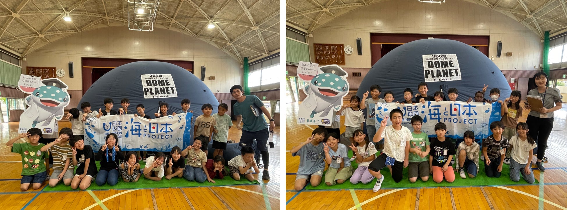 体育館に突如現れた巨大なエアドームに、子どもたちは興味津々な様子でした。興奮冷めやらぬ中ドームに入ると、360度に広がる海の世界に歓声が上がりました。ナビゲーターのジンベエザメ「ブッチくん」が登場すると、子どもたちは積極的にクイズに答えたり、質問を投げかけたりと、リアルタイムの会話に夢中になっていました。楽しいクイズだけでなく、ブッチくんが地球温暖化など海洋問題について話し始めると、子どもたちの表情は真剣そのものになり、ブッチくんの話と映像を食い入るように見つめ、海の問題を自分ごととして捉える様子がうかがえました。また、先生が考えた地元の海に関するオリジナルクイズが出題されると、身近な話題ということもあり、ひときわ大きな声が響き渡り、学びと楽しさが一体となった空気に包まれました。