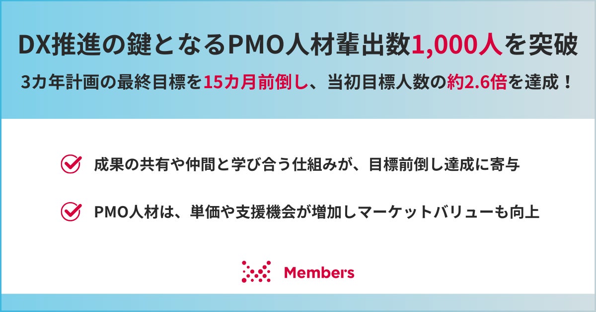 DX現場支援で顧客と共に社会変革をリードする株式会社メンバーズ(本社:東京都中央区、代表取締役社長:髙野 明彦、東証プライム:2130、以下「メンバーズ」)は、2024年5月より開始した企業におけるDX推進の鍵となるプロジェクトマネージャーをサポートするPMO(プロジェクト・マネジメント・オフィス)人材の輩出数が、2025年12月時点で累計1,000人を突破したことをお知らせします(※1)。当初想定よりもさまざまな領域のデジタル人材がPMO育成カリキュラムを受講した結果、2024年5月に掲げた中期事業戦略における、2027年3月末までに385人輩出という最終目標を15カ月前倒しで達成し、輩出人数は当初目標の約2.6倍に到達しました。