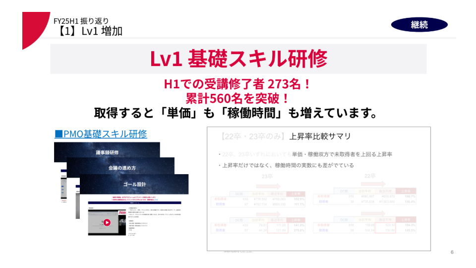 カリキュラム受講前後や、受講者と非受講者を比較したところ、一人当たりの売上単価(人月単価)や、取引先企業の支援機会が増加していることが判明。マーケットバリューの向上という結果を社内へ公開