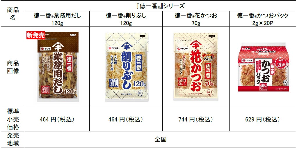 ヤマキは、現在ご愛顧いただいている「徳一番®花かつお 70g」「徳一番®かつおパック 2g×20P」「徳一番®削りぶし120g」と合わせ、『徳一番®』シリーズとして削りぶし市場を盛り上げてまいります。