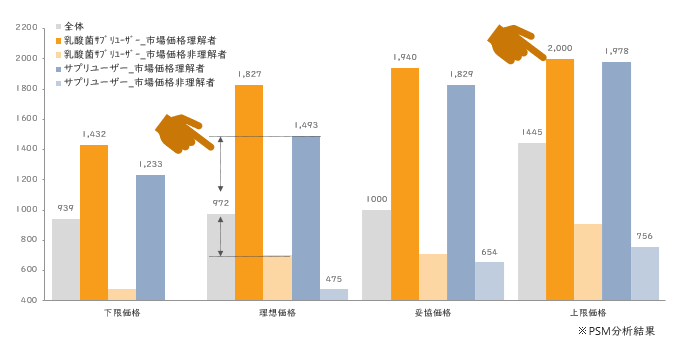 同一カテゴリ(乳酸菌)サプリユーザーで市場価格を理解している人の受容価格が最も高い