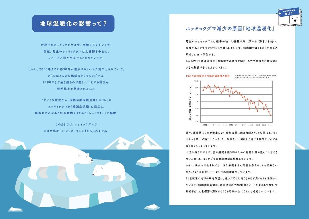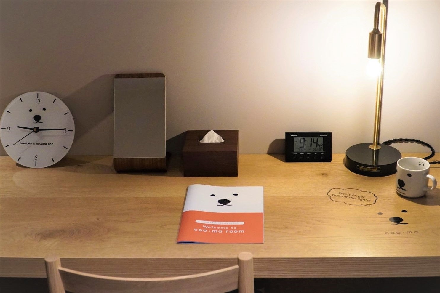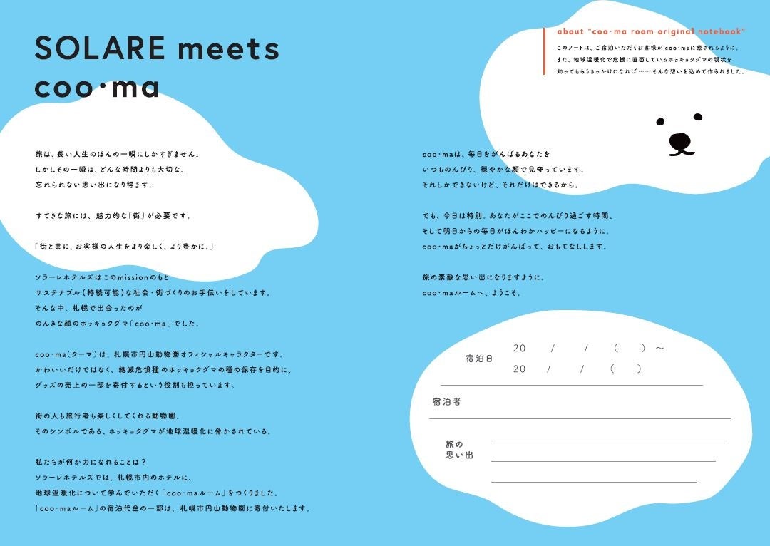 『coo・maルーム』にSDGsプランで宿泊すると、札幌市円山動物園が制作協力したオリジナルのcoo・maブックがもらえます。地球温暖化が招いたホッキョクグマの絶滅危機や、SDGsについて分かりやすく説明してあるほか、coo・maのモデルとなったホッキョクグマの話、名前の由来や、グッズ情報などもあり、楽しく読める冊子です。旅の思い出もメモして、自分だけの一冊として記念にお持ち帰りいただけます。