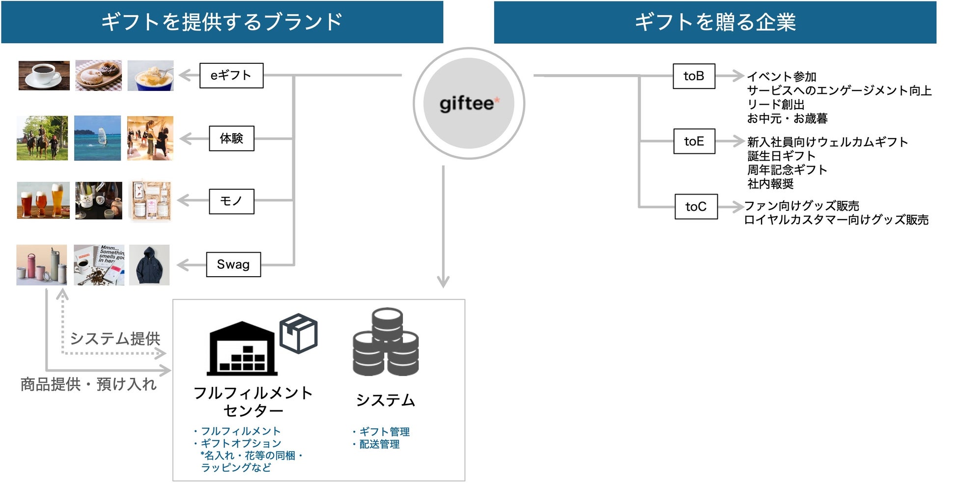 企業が、取引先やクライアントを対象にBtoBや、従業員を対象としたBtoEのギフトシーンでCorporate Giftを贈る際のプラットフォームとなるサービスを提供します。サービス提供の対象は、Corporate Giftを贈る企業およびCorporate Giftを提供するブランドであり、ギフトコンテンツやギフトの企画や製作に関する企画支援をはじめ、受発注のプロセスをデジタル化、オートメーション化し容易にするための仕組みも両者に提供いたします。