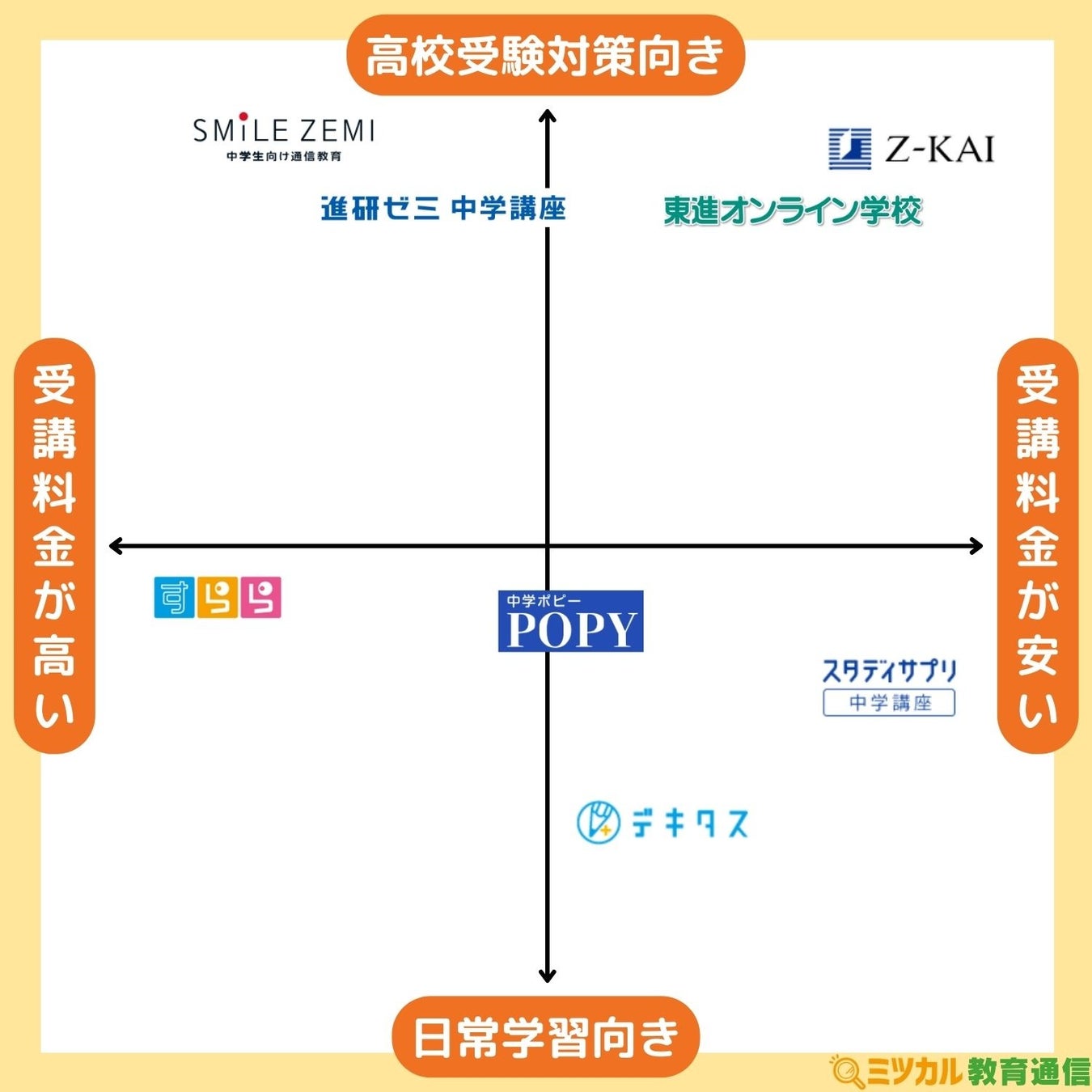 そこで、少しでもお子様の通信教育選びをサポートできるよう、「ミツカル教育通信」は『中学生向け通信教育 ポジショニングマップ』を作成しました。