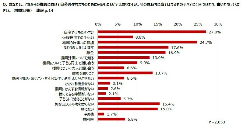3. 今後の復興に向けて何か行動したいという選択肢を1つでも選択した子どもは64.0%(1,313人)と6割を超え、復興に関する選択肢のうち1つでも選択した子どもが21.2%(435人)いた。また、大人や社会に伝えたいことの有無について「いいえ」「わからない」を選択した子どもであっても、何か行動したいという選択肢を選んでいる子どもが一定数いた。これらの結果から、復興のために何かしたい・話したいと思う子どもたちに、今後、大人側が何らかの機会を提供していくことが重要だと考える。