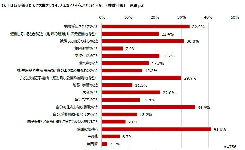 5. 子どもの意見を聴いてほしいという意見もあった。「直接、大人たちと話しあい、子どもの意見や思いを取り入れてほしい」という声は、少数であったとしても子どもの権利保障の観点から重要である。こうした声を地域の大人が尊重することによって、今後の復興や防災に子どもたちが主体的に関わっていこうという思いの醸成につながるだろう。