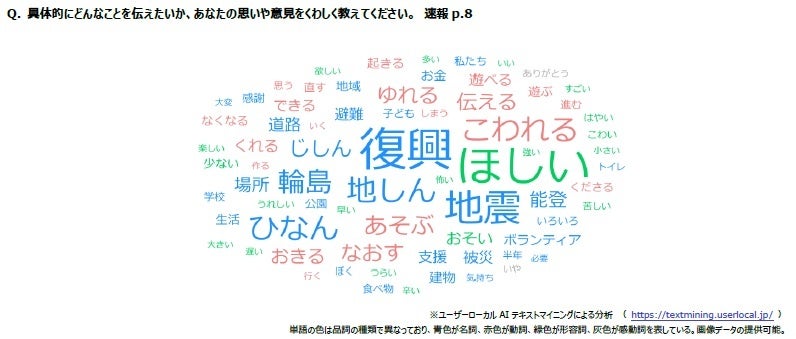 子ども支援専門の国際NGO、公益社団法人セーブ・ザ・チルドレン・ジャパン(理事長:井田 純一郎、以下「セーブ・ザ・チルドレン」)は、能登半島地震から半年が経過した7月に、被災地の子どもたちに「国・自治体の大人や地域の人たち、保護者らにいま伝えたい思い」を聴くために、小学4年生~高校生世代を対象にアンケート調査を実施しました。