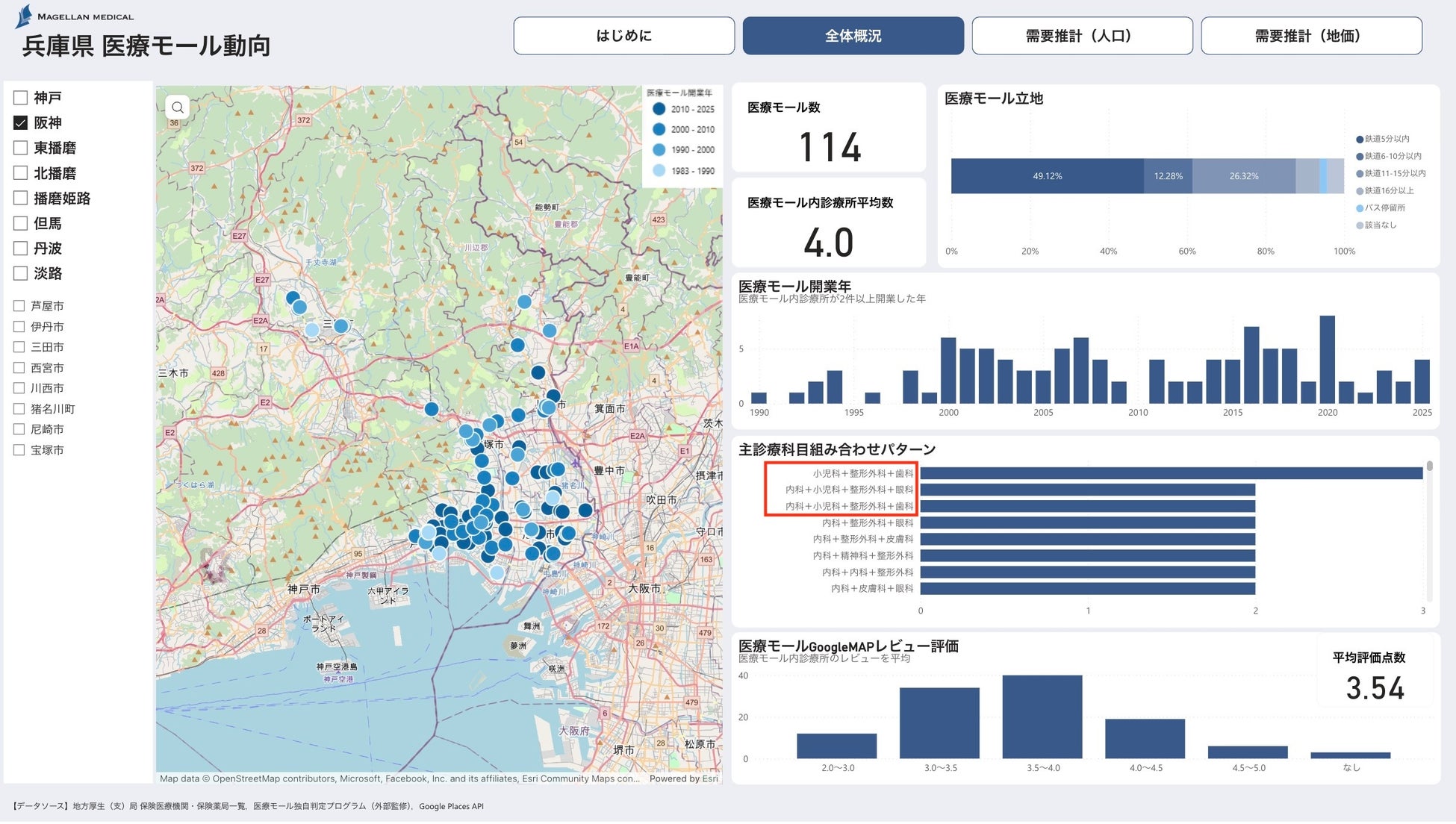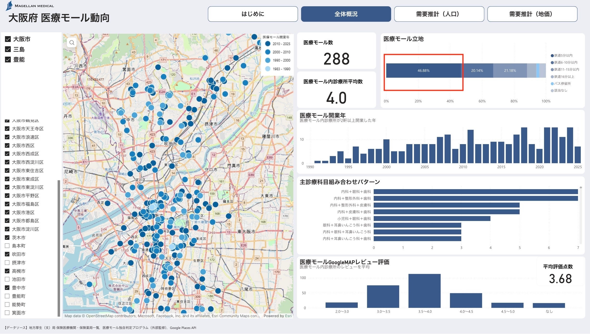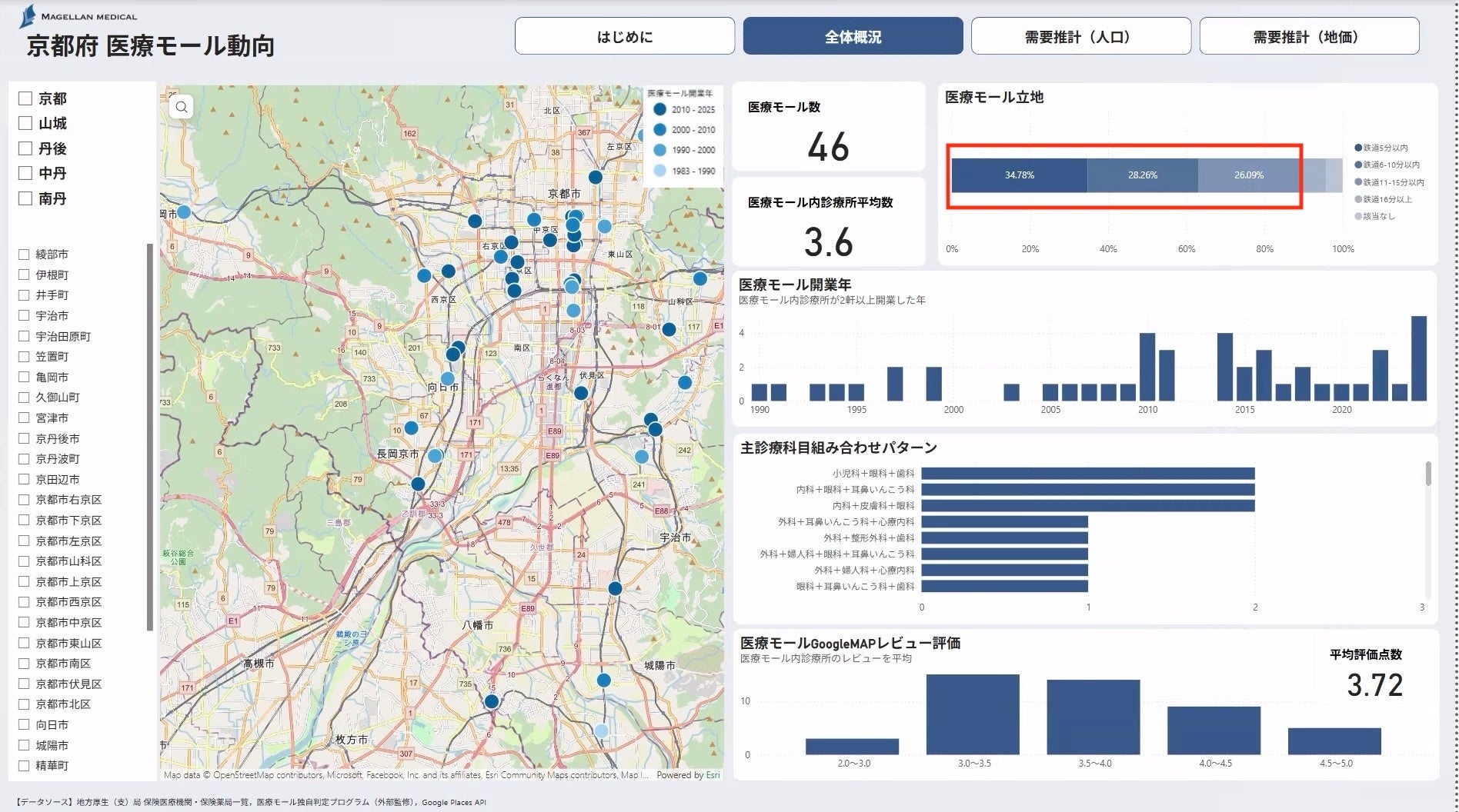 医療モール経営の羅針盤を目指す株式会社マゼランメディカル(本社:東京都品川区、代表取締役社長:杉本哲哉)は、Microsoft Power BIを活用した「医療モール市場動向ダッシュボード」の公開エリアを拡大し、2025年12月公開の神奈川県版に続き、京都府・大阪府・兵庫県の近畿3府県版を新たに無料公開いたしました。また、独自の医療モールデータを沿線別など様々な観点で分析したデータ・インサイトを保有し、近畿エリアにおける医療モール市場の変遷を明らかにしました。