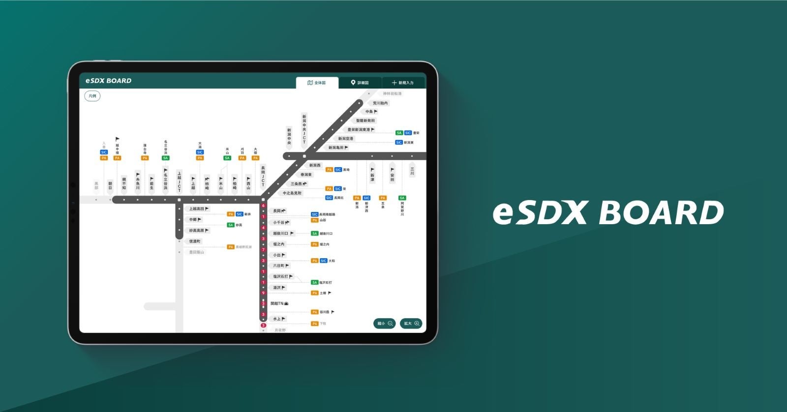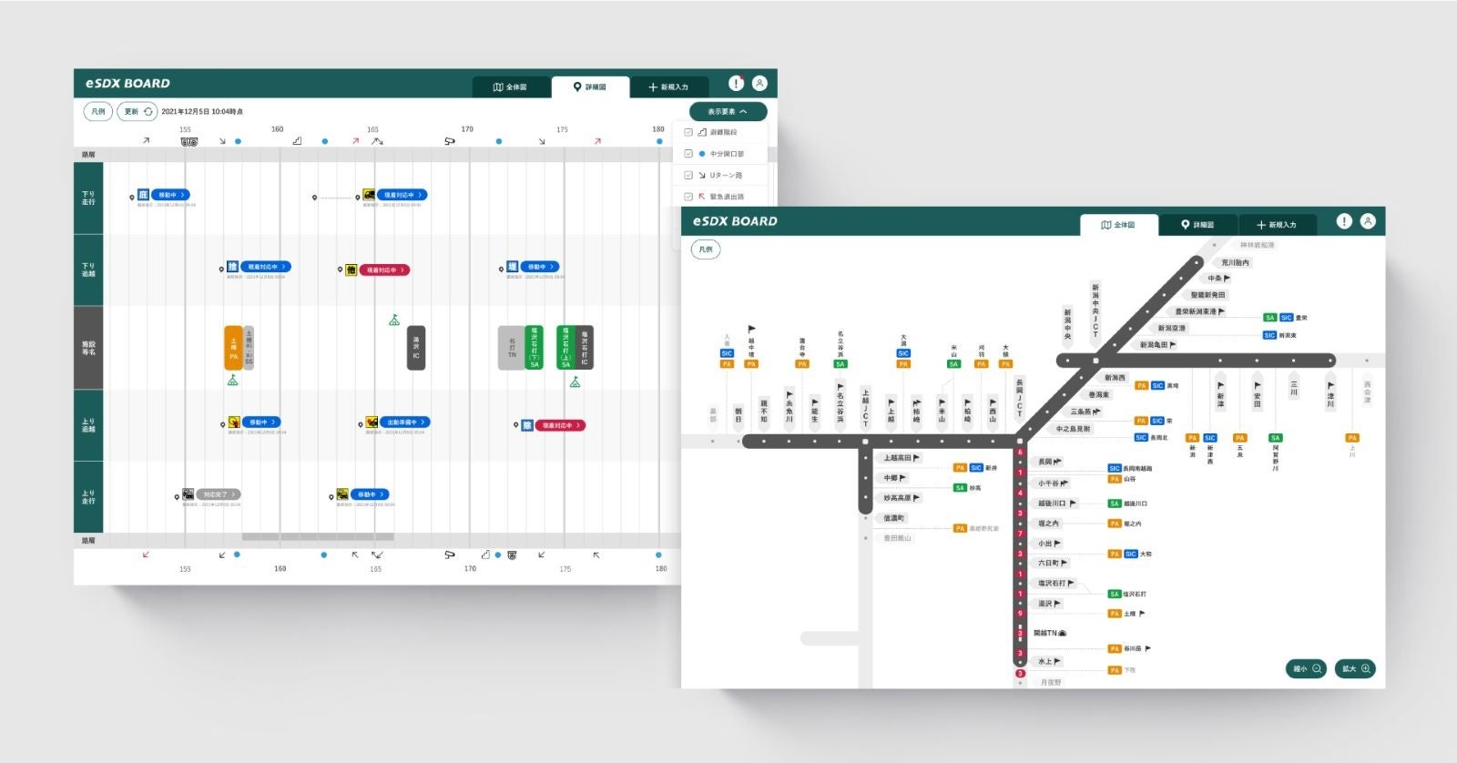 eSDX BOARDでは、道路の起点からの距離値を示すキロポストによる位置情報を元に事故やトラブルといった発生事象をオンライン地図上で可視化。これまで電話や無線、ホワイトボード、表計算ソフトなどで行っていた情報管理や指示伝達の状況を、防災対策本部と現場の双方が最新・かつ正確な状態で確認できることができます。