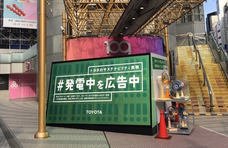 今回、多くの方が行き交う渋谷で、「トヨタのサステナビリティ実験 #発電中を広告中」と題し、景観に溶け込みながら本当に発電できることを実証実験。発電した電気で扇風機を動かすことで、発電の見える化を図ります。
