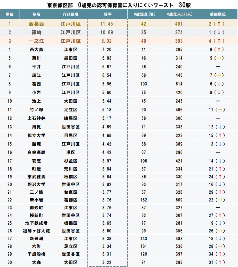 ■今年の認可保育園入りにくい駅ランキングは、1位西葛西(前年2位)2位篠崎(同1位)3位一之江(同4位)
