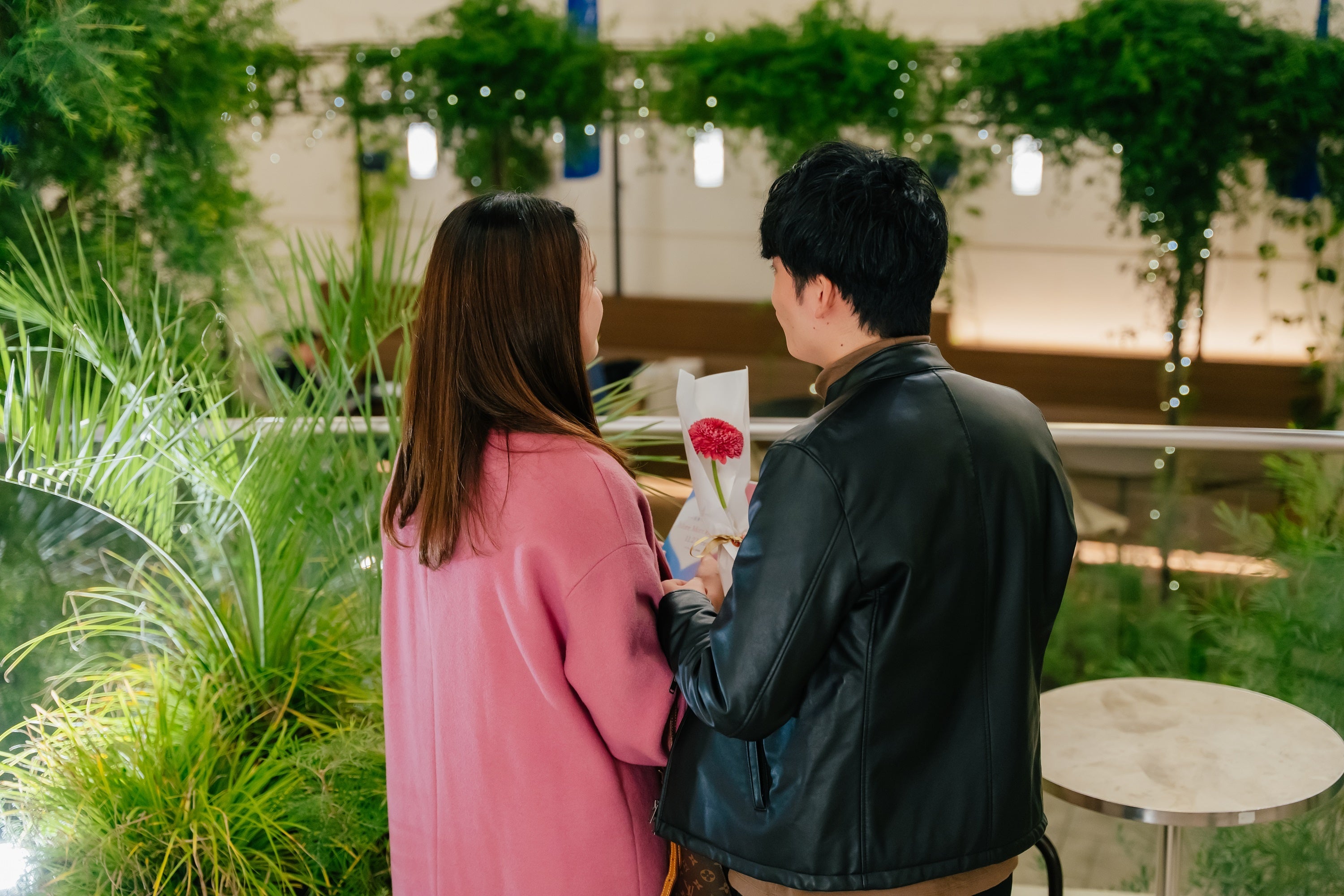 「Thanks フラワー」では、夫から妻へ、妻から夫へ好きなところを伝えながら、「感謝」の花言葉を持つピンクのガーベラをお渡しいただきました。気持ちを伝える側も、受け取る側も、照れながら笑顔があふれる時間でした。