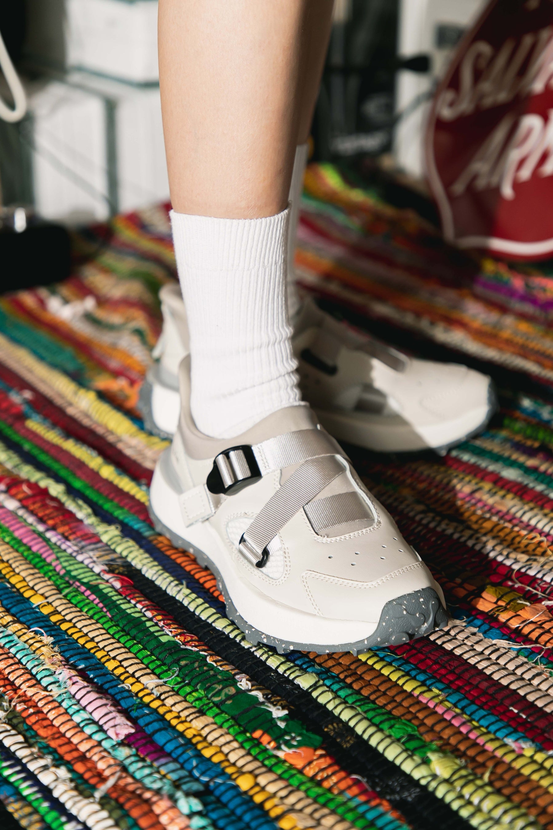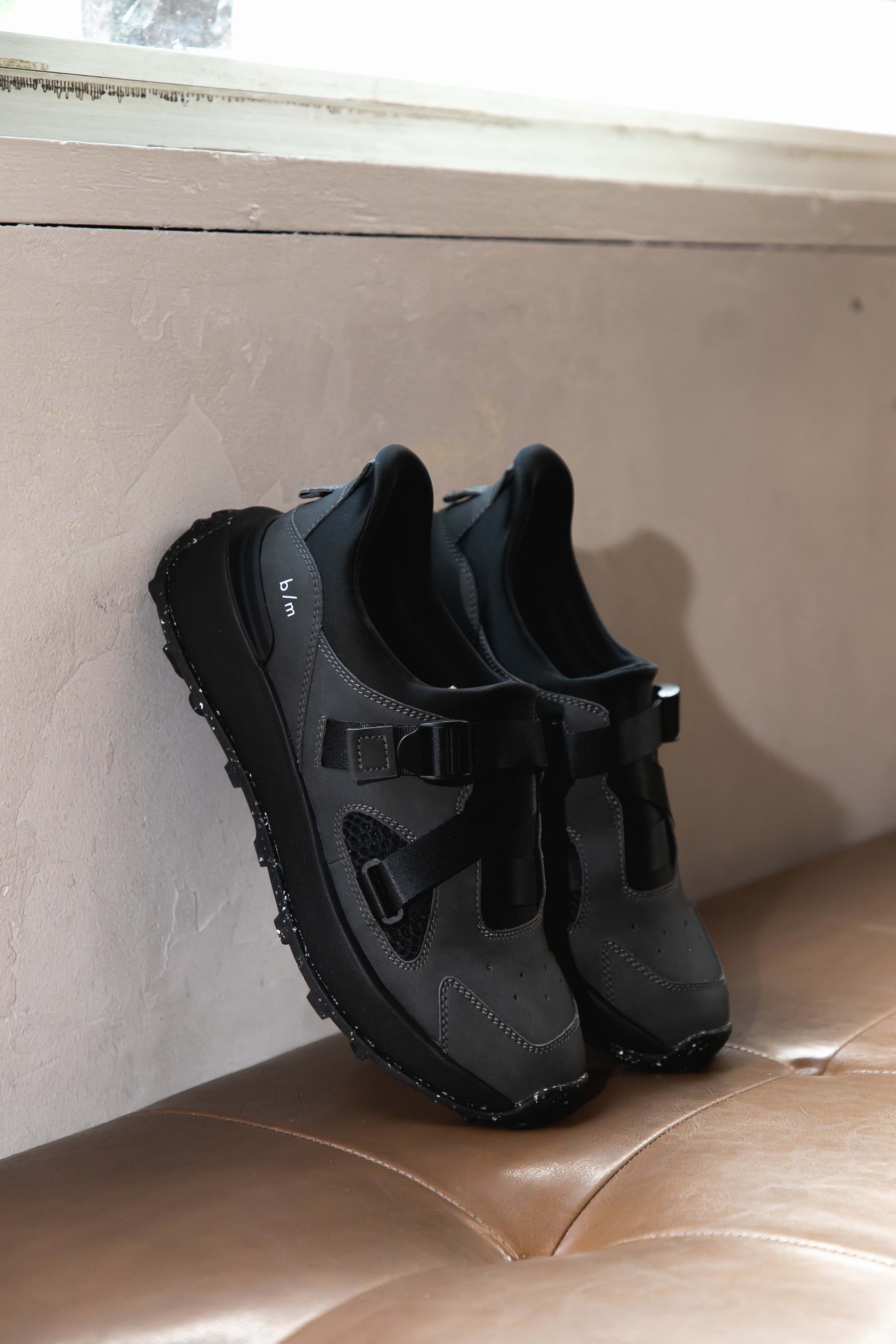 デザインテーマは2025年春夏コレクションに引き続き第2弾となる「meli-melo(メリメロ)」。フランス語で“ごちゃまぜ”や“いろいろなもの”という意味で、ブランドコンセプトにある日々変わりゆく常識や多様性の広がる社会から着想を得ています。「meli-melo」をテーマしたモデルは、秋冬新作を合わせると全4型。一つのテーマを据えながらも各種各様の個性を持たせている“いい意味での統一感のなさ=ごちゃごちゃ感”を楽しんでほしいという思いを込めています。「B/Mアイビーモック」はバックルでフィット感の調整も容易なモックタイプのスニーカーです。ボリュームフォルムのレトロランソールにアッパーをツタのように這うテープ使いがデザインのポイント。ワントーン配色で全体を落ち着いた印象に仕上げています。サイズは22.0cm~28.0cmのユニセックス展開。アッパーにはボンデッドレザーファイバ(皮革繊維再生複合材)、インソールにはリサイクルメッシュ、ソールにはリサイクルラバーを採用。履き心地にもこだわり、接地面を広げたアウトソールと踵部のスタビライザーが着地の安定性を保ち、全面に通気ホールを施した「アブソレン®」搭載のカップインソールがクッション性とフィット感を高めます。街履きだけでなくアウトドアや旅行にもおすすめです。